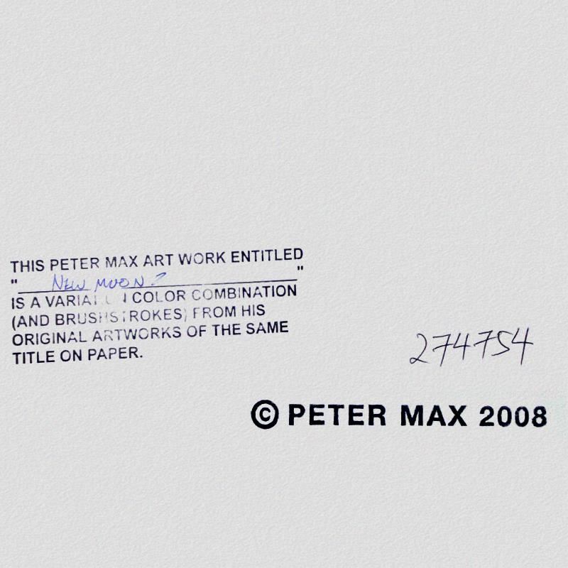 "New Moon 2" is a one-of-a-kind mixed media on paper, hand signed by Peter Max. The piece comes custom framed with a backside cutout to display Peter Max Studio registration number 274754 certifying authenticity. Measures approximately 36" x 48" (frame), 24" x 36" (image).
