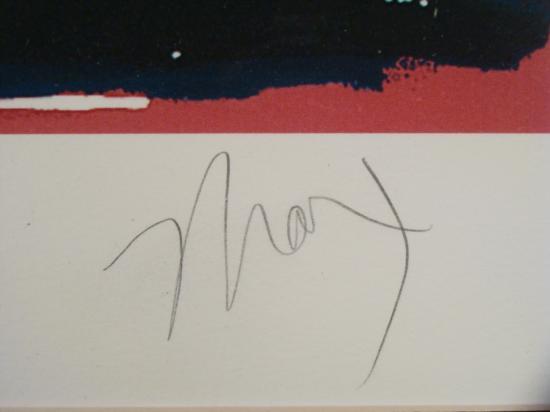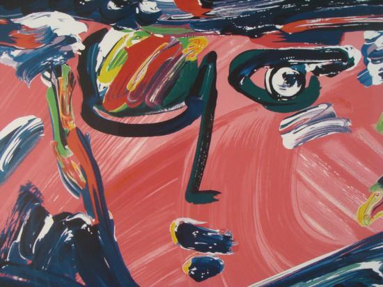 In this limited edition print, visionary artist Peter Max portrays a character known as "Zero." Mostly red and pink, this Zero is brimming with colors, and expressive brushstrokes. Artist: Peter Max Title: "Zero Megalopolis" Medium: Print Signature: "MAX" by the artist in pencil, lower right Edition: 129 from a Limited Edition of 150, marked in pencil, lower left Image size: 29 1/2 x 40 inches Framing: Custom framed, double matted in black and white, in black laminate wood frame Frame size: 44 1/2 x 55 1/2 inches Condition: Excellent; small chip on the frame, upper right corner Certificate of Authenticity: Included Peter Max is a Pop icon himself, and Zero is quite iconic as well. This is your chance to own a signed image from a legendary artist that influenced generations of popular art and design. Biography: Peter Max (1937-__) was born in Berlin, grew up in China, and traveled with his family to Israel and throughout Europe before eventually arriving in America. He began painting, and soon rose to prominence in the mid 1960's with expressionistic art that explored wild color juxtapositions. His work in the 1970's included a commission for a postage stamp in the theme of environmental preservation, a cause in which he devoted himself. Max has painted four former U.S. Presidents: Carter, Ford, Bush and Reagan. His concern for world peace has led to his involvement in some significant political events, including stamp designs for the first United Nations Environmental Summit, and a carving from a portion of the Berlin Wall. He has been the official artist for the World Cup USA, the Super Bowl, and the Grammy Awards. His awards are numerous, and include honorable recognition for product, fashion, food, book, and poster designs. His latest project is a collaboration with computer effects producer Silicon Graphics. Peter Max has continued his optimistic world vision into the new Millennium, and strives to be a "Global Artist." *