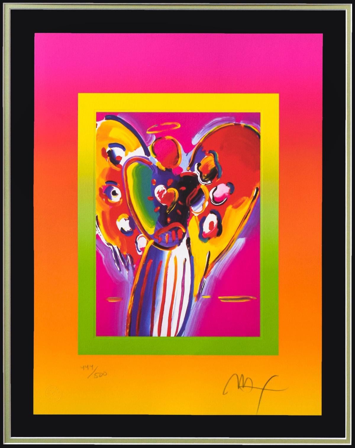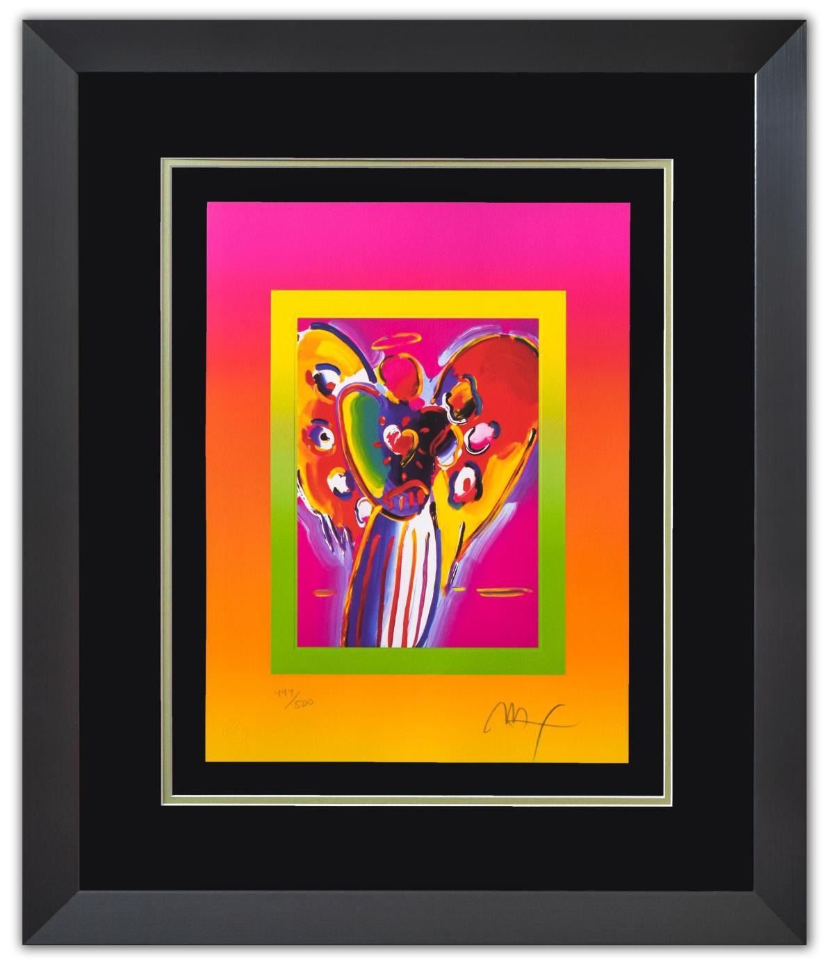 Artist: Peter Max. Medium: Original Lithograph. Title: Angel With Heart. Size (Unframed): 17" x 13". Measures approx. (Framed): 28" x 24". Certificate of Authenticity: From Peter Max Studio. Additional: Custom framed. Reference# 15882.