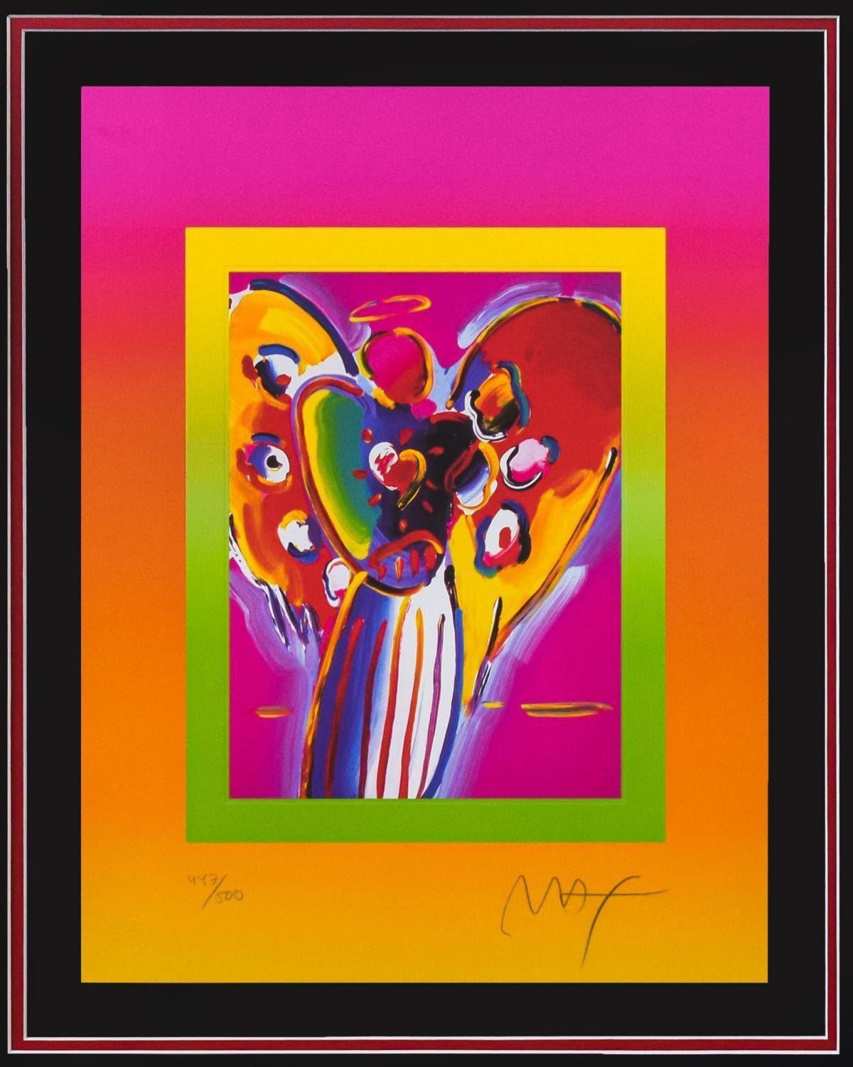 Artist: Peter Max. Medium: Original Lithograph. Title: Angel with Hearts on Blends II. Size (Unframed): 17" x 13". Size (Framed): 31" x 27". Certificate of Authenticity: From Peter Max Studio. Additional: Custom framed. Reference# 15150.