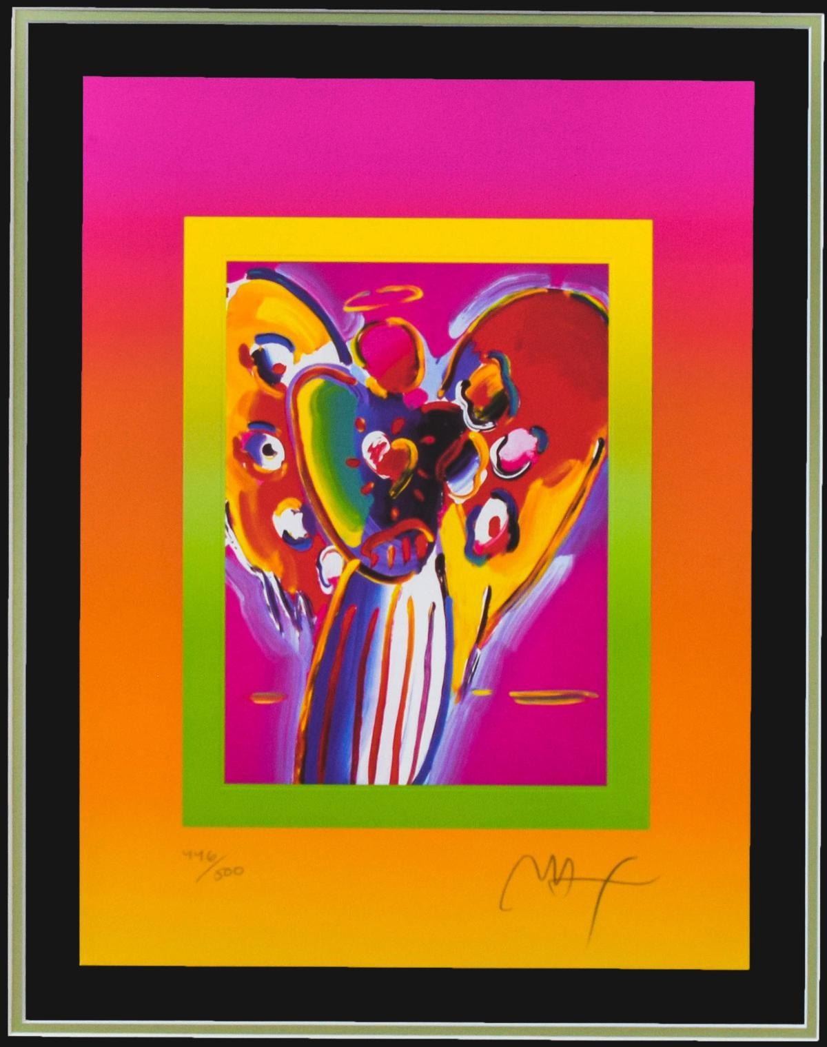 Artist: Peter Max. Medium: Original Lithograph. Title: Angel with on Blends. Size (Unframed): 17" x 13". Size (Framed): 29.5" x 25.5". Certificate of Authenticity: From Peter Max Studio. Additional: Custom framed. Reference# 15584.