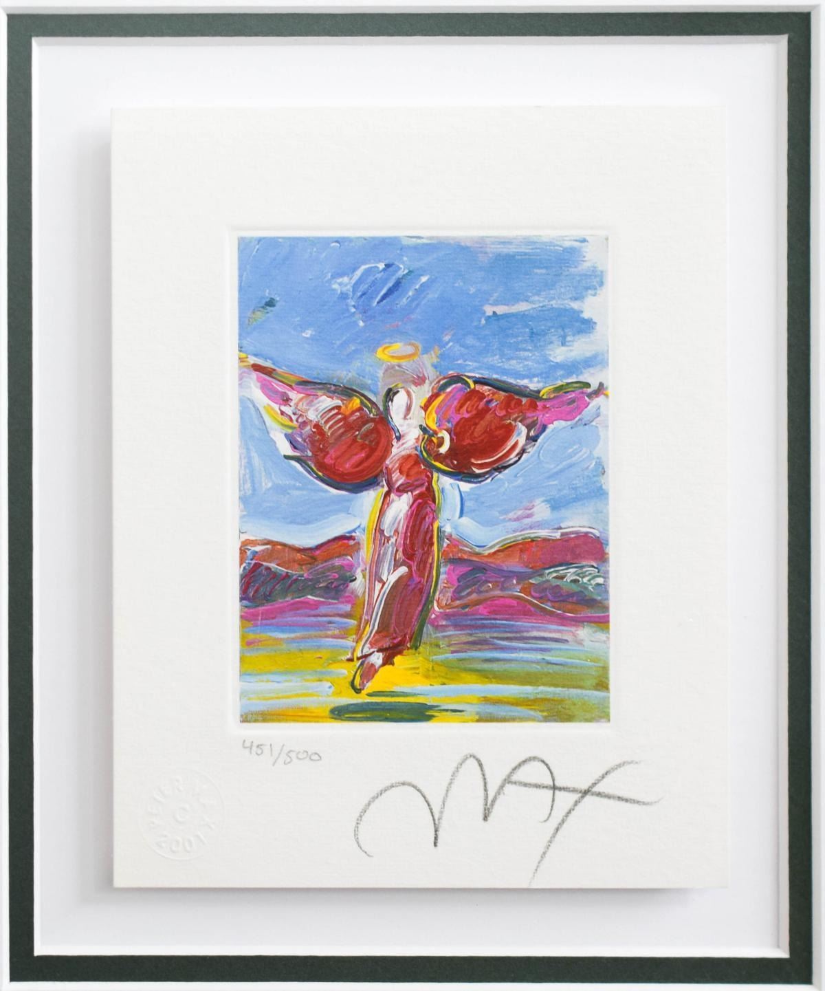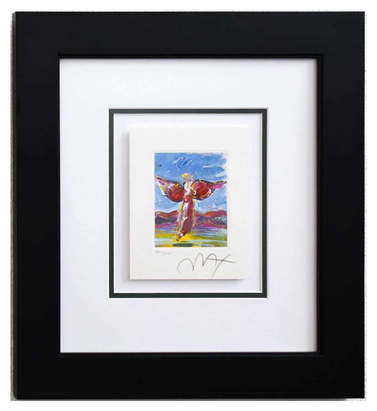 Artist: Peter Max. Medium: Original Lithograph. Title: Ascending Angel (Mini). Size (Unframed): 6" x 5". Size (Framed): 15.5" x 14". Limited Edition: Numbered 451/500. Certificate of Authenticity: From Peter Max Studio. Additional: Custom framed. Reference# 11753.