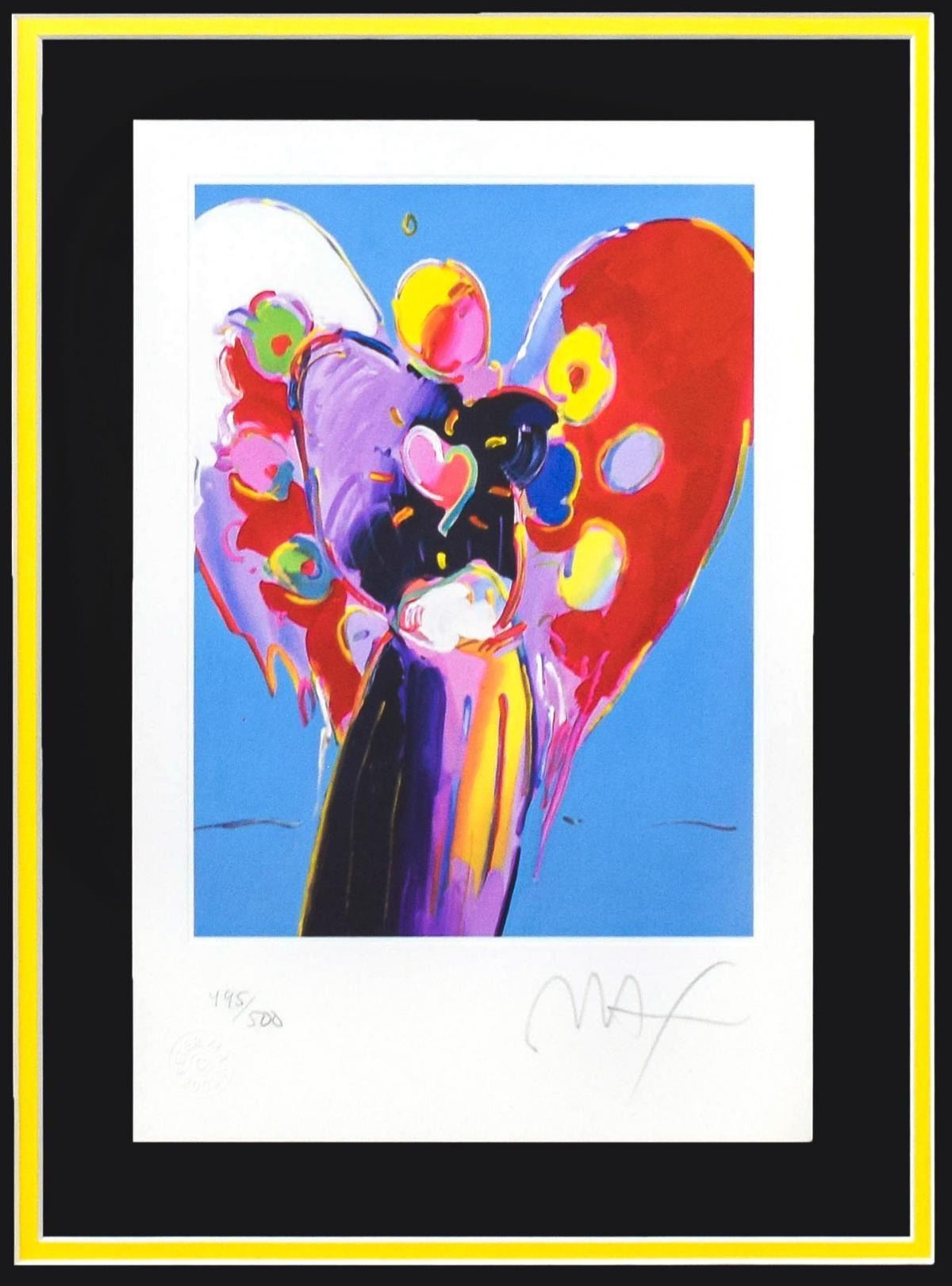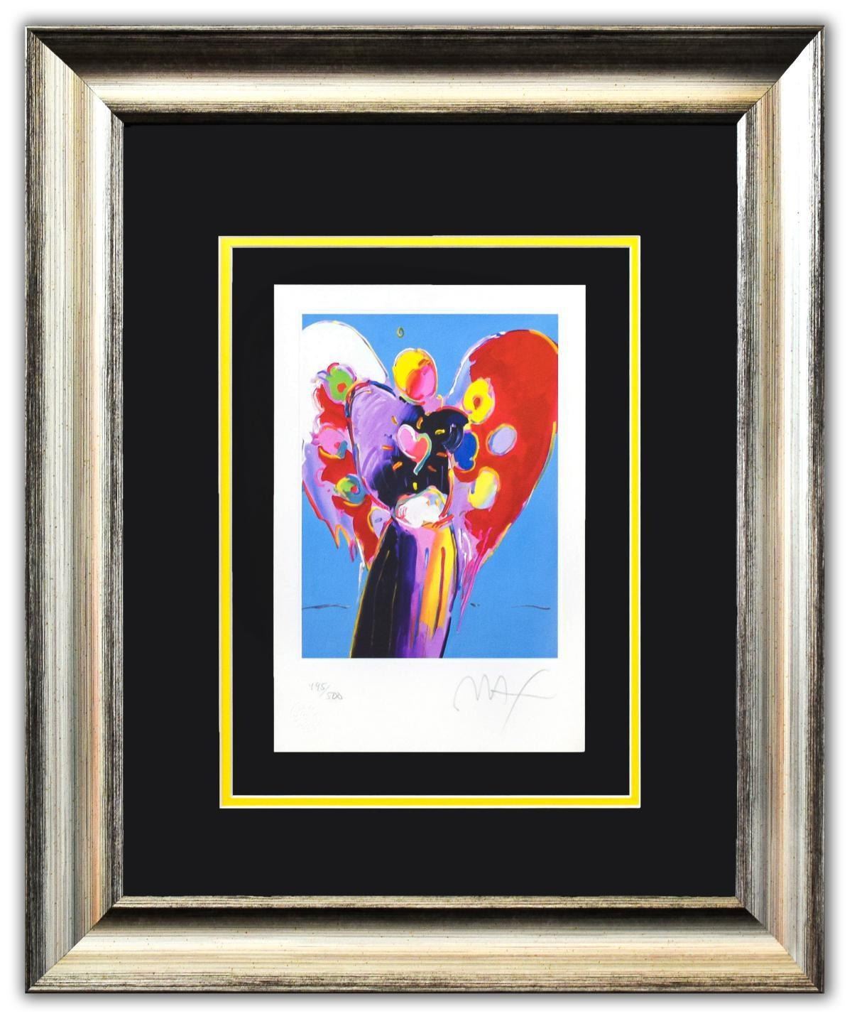 Artist: Peter Max. Medium: Original Lithograph. Title: Blue Angel with Heart. Size (Unframed): 11" x 8". Size (Framed): 23" x 20". Certificate of Authenticity: From Peter Max Studio. Additional: Custom framed. Reference# 15041.
