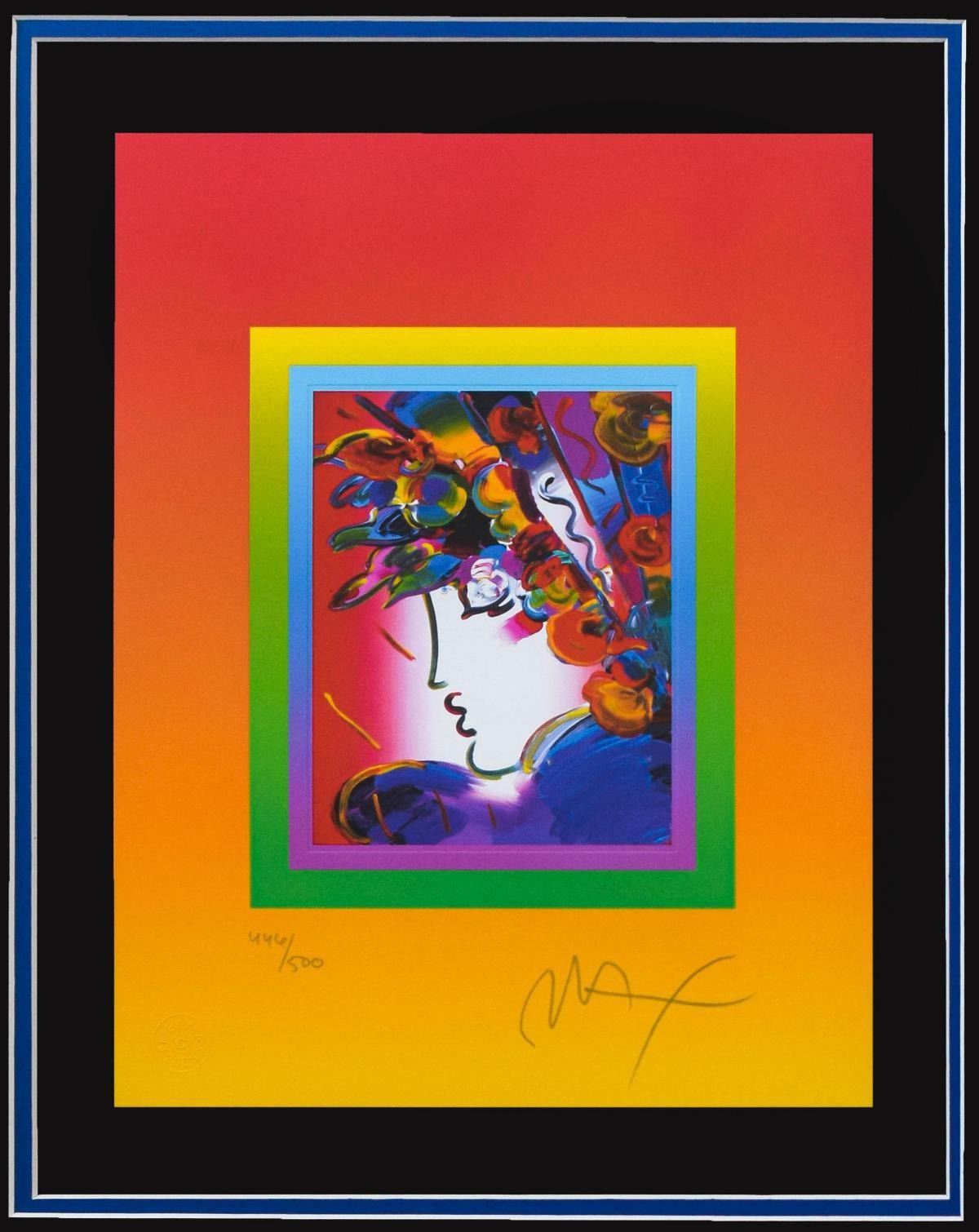 Artist: Peter Max. Medium: Original Lithograph. Title: Blushing Beauty on Blends 2006. Size (Unframed): 12" x 10". Size (Framed): 27" x 24". Certificate of Authenticity: From Peter Max Studio. Additional: Custom framed. Reference# 15312.