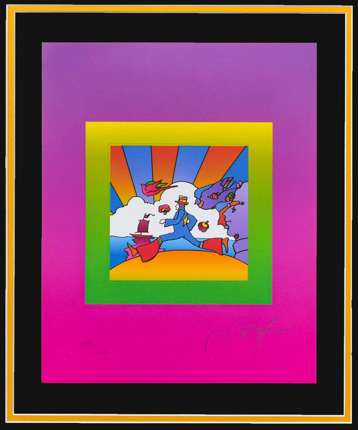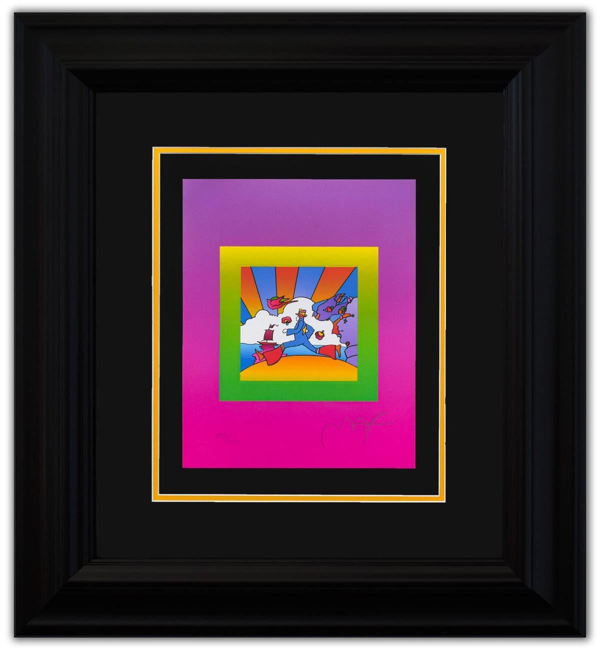 Artist: Peter Max. Medium: Original Lithograph. Title: COSMIC RUNNER on Blends Ver. II. Size (Unframed): 13" x 10". Measures approx. (Framed): 28" x 24". Certificate of Authenticity: From Peter Max Studio. Additional: Custom framed. Reference# 15306.