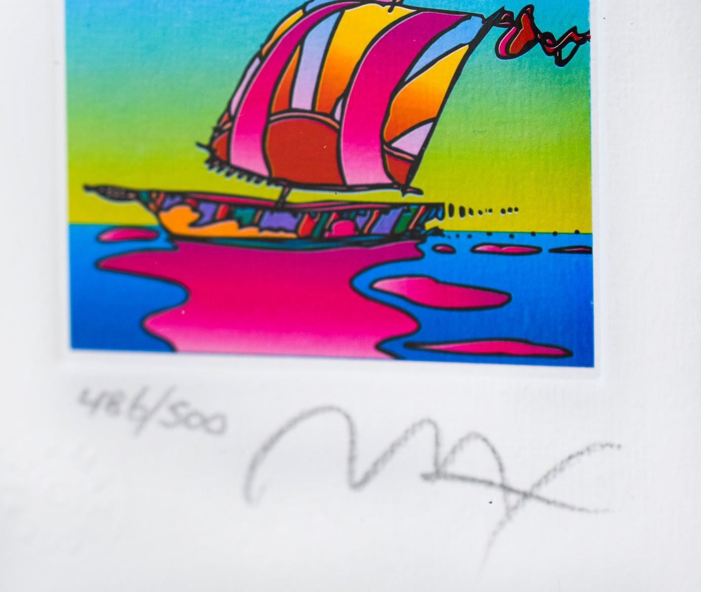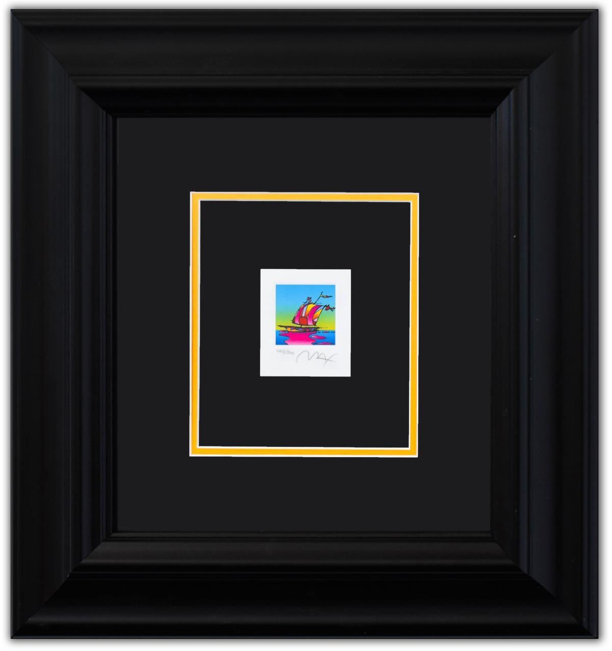 Artist: Peter Max. Medium: Original Lithograph. Title: COSMIC SAILBOAT. Size (Unframed): 3.5" x 3". Measures approx. (Framed): 21" x 20". Certificate of Authenticity: From Peter Max Studio. Additional: Custom framed. Reference# 15917.