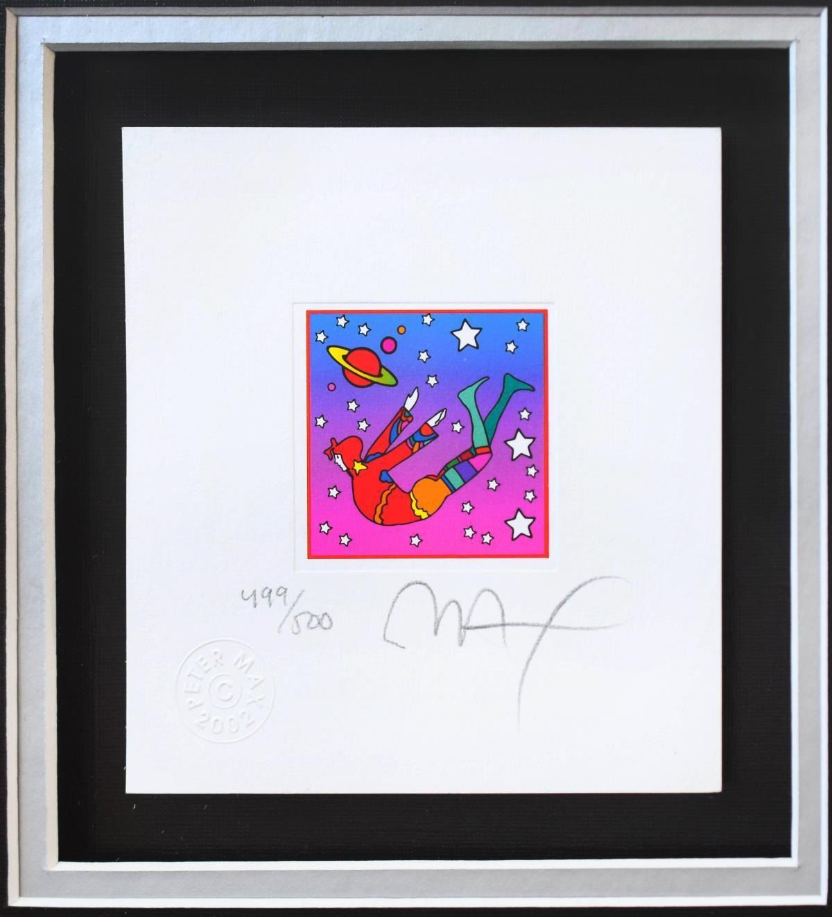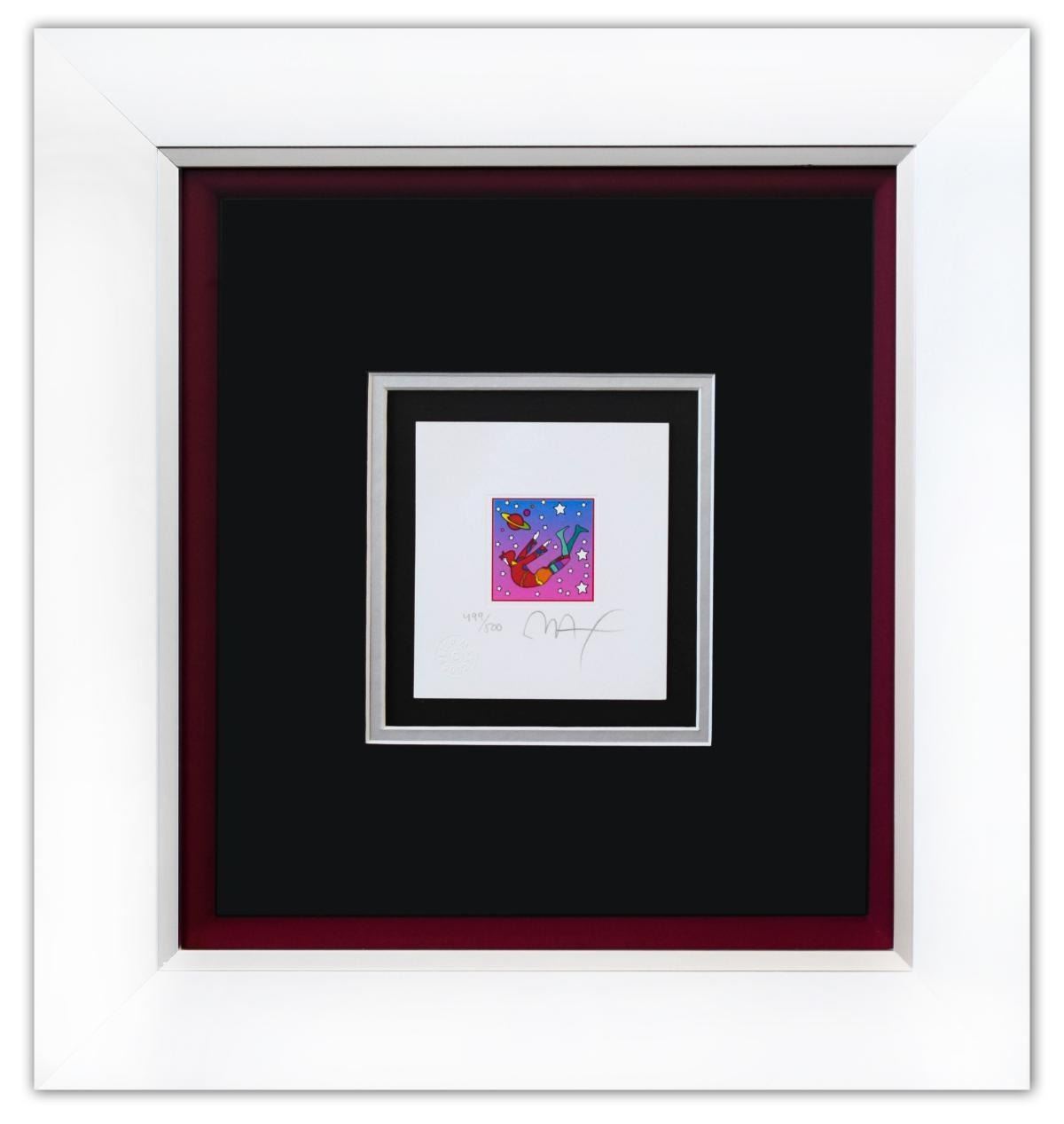 Artist: Peter Max. Medium: Original Lithograph. Title: Cosmic Flyer in Space Ver. II (Mini). Size (Unframed): 4.5" x 4.5". Size (Framed): 17.5" x 18.5". Certificate of Authenticity: From Peter Max Studio. Additional: Custom framed. Reference# 14114.