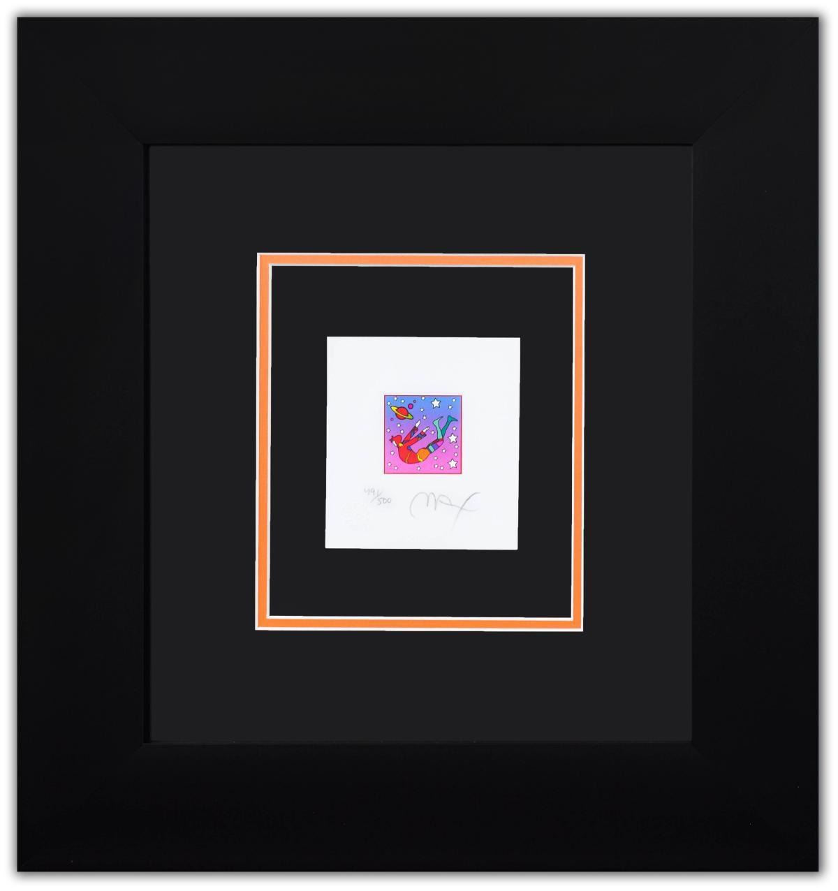 Artist: Peter Max. Medium: Original Lithograph. Title: Cosmic Flyer in Space Ver. II (Mini). Size (Unframed): 3.5" x 3". Size (Framed): 21" x 20". Certificate of Authenticity: From Peter Max Studio. Additional: Custom framed. Reference# 15916.