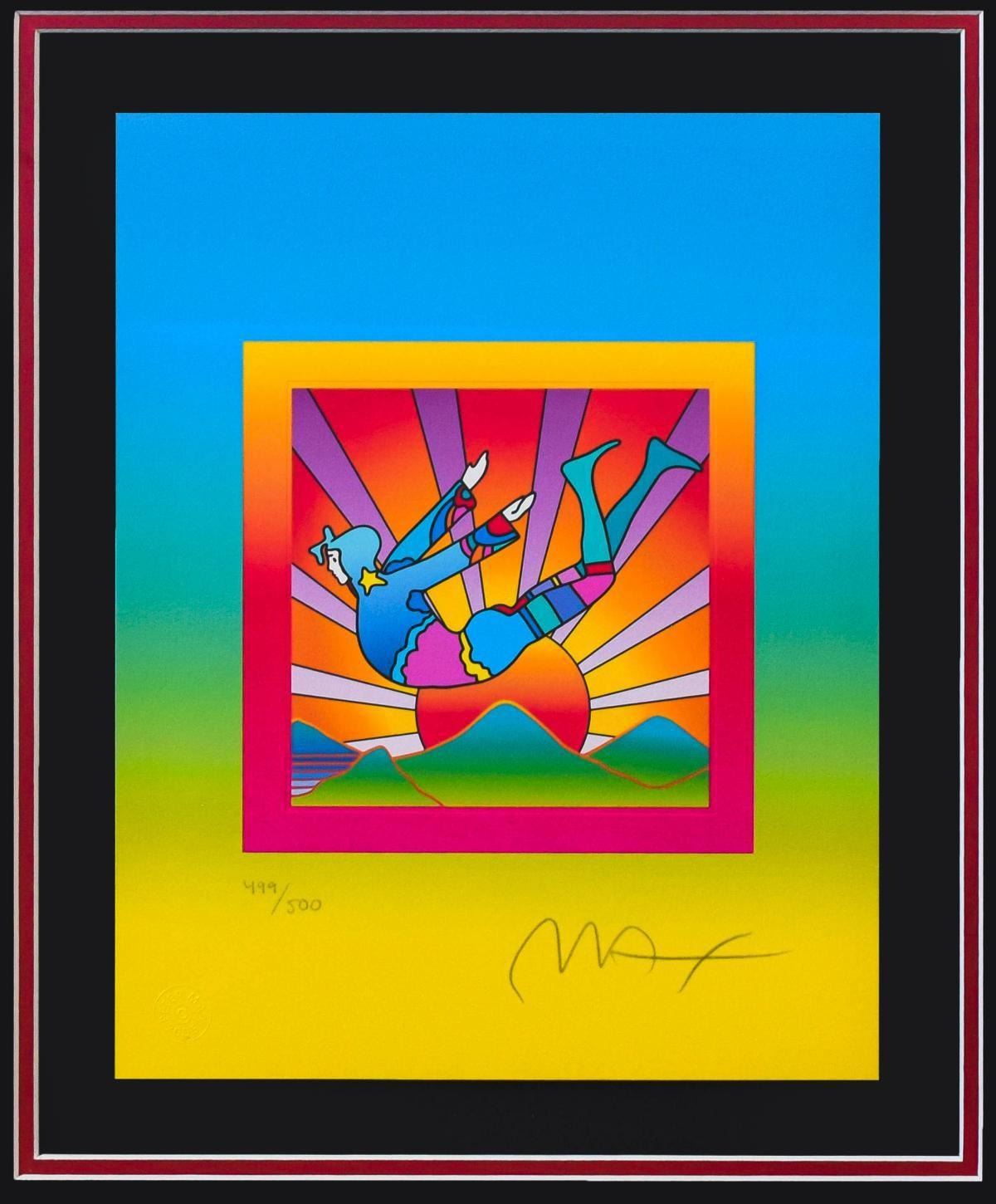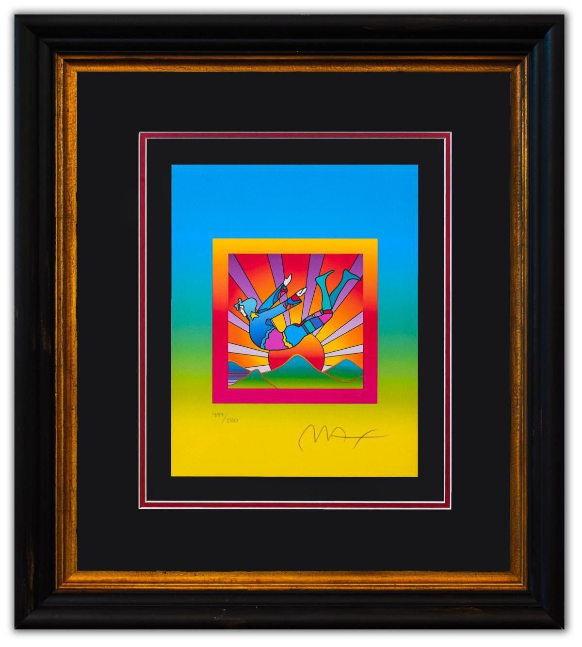 Artist: Peter Max. Medium: Original Lithograph. Title: Cosmic Flyer on Blends. Size (Unframed): 12.5" x 10". Size (Framed): 25" x 22". Certificate of Authenticity: From Peter Max Studio. Additional: Custom framed. Reference# 14695.