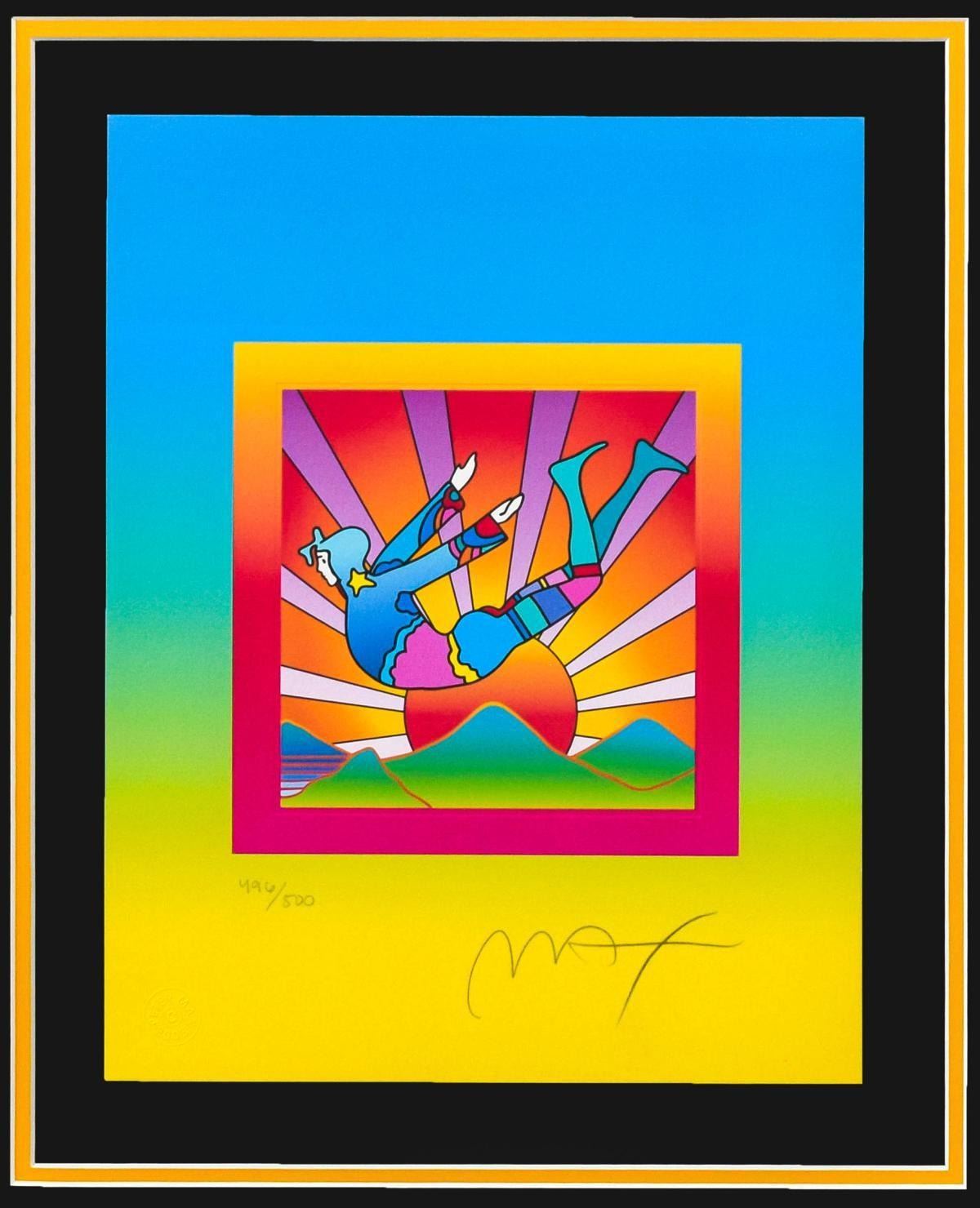 Artist: Peter Max. Medium: Original Lithograph. Title: Cosmic Flyer on Blends. Size (Unframed): 12.5" x 10". Size (Framed): 26" x 23". Certificate of Authenticity: From Peter Max Studio. Additional: Custom framed. Reference# 15042.
