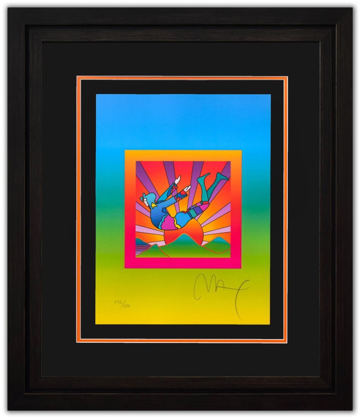 Artist: Peter Max. Medium: Original Lithograph. Title: Cosmic Flyer on Blends. Size (Unframed): 17" x 13". Size (Framed): 29" x 25". Certificate of Authenticity: From Peter Max Studio. Additional: Custom framed. Reference# 15802.