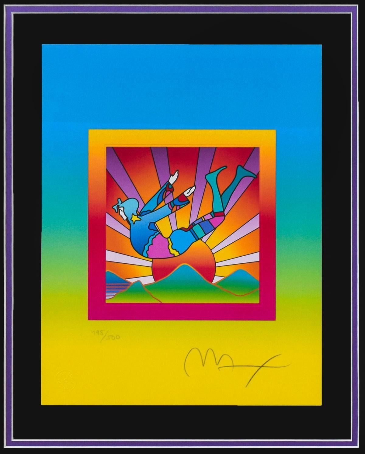 Artist: Peter Max. Medium: Original Lithograph. Title: Cosmic Flyer on Blends. Size (Unframed): 13" x 10". Size (Framed): 28" x 24". Certificate of Authenticity: From Peter Max Studio. Additional: Custom framed. Reference# 15305.