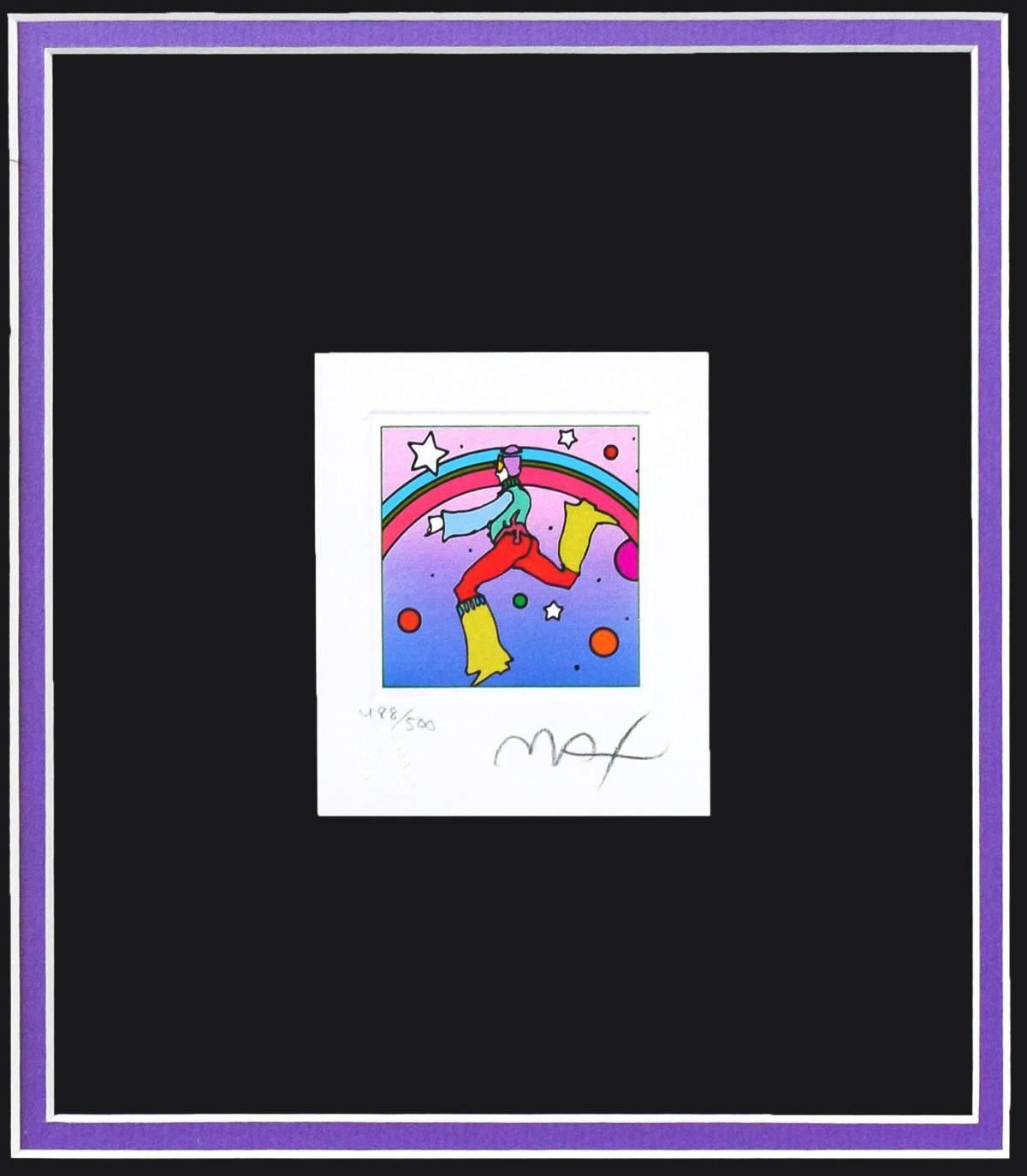 Artist: Peter Max. Medium: Original Lithograph. Title: Cosmic Jumper Detail I (Mini). Size (Unframed): 3.5" x 3". Measures approx. (Framed): 17" x 16". Certificate of Authenticity: From Peter Max Studio. Additional: Custom framed. Reference# 15032.