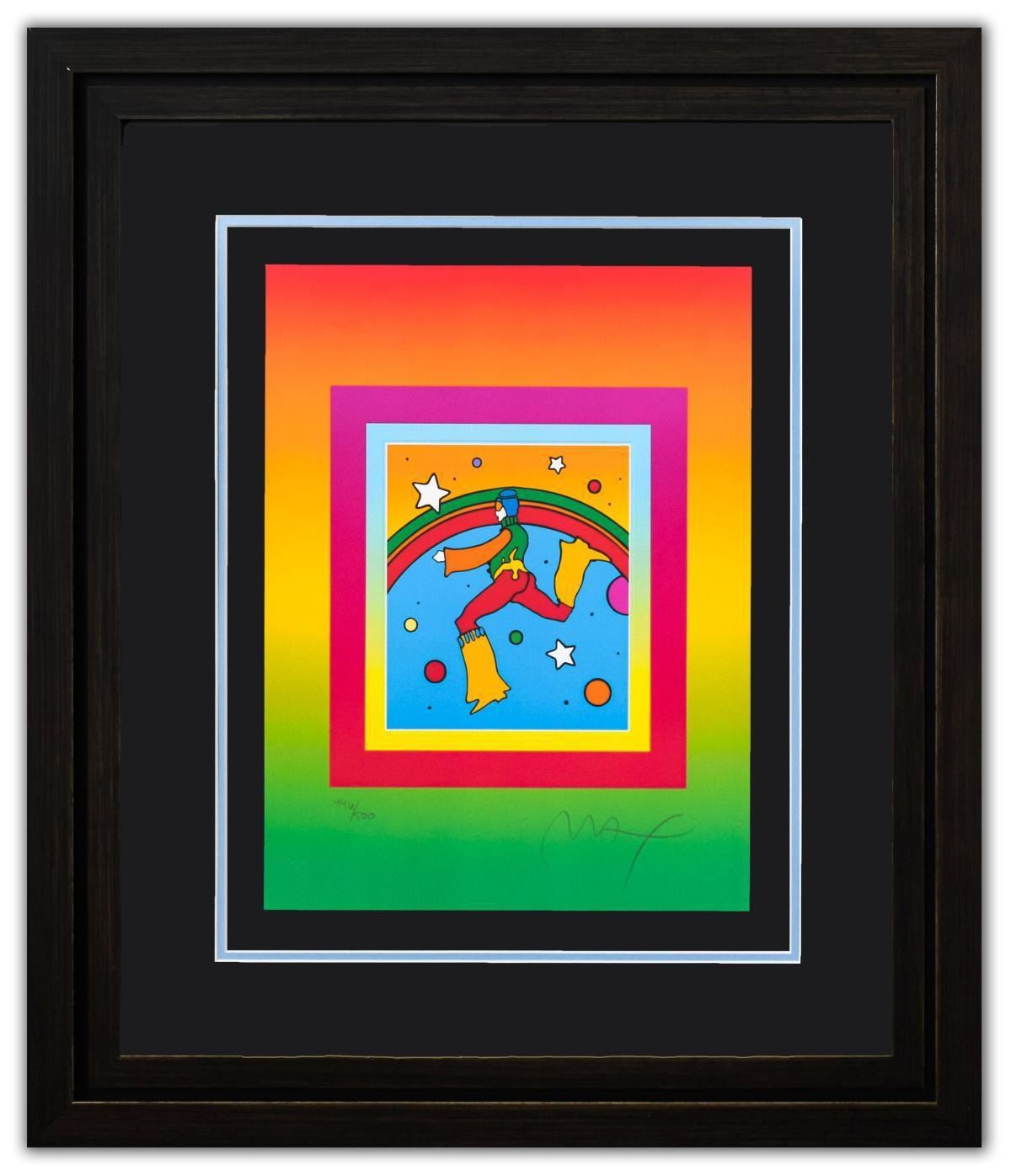 Artist: Peter Max. Medium: Original Lithograph. Title: Cosmic Jumper on Blends. Size (Unframed): 17" x 13". Size (Framed): 29.5" x 25.5". Certificate of Authenticity: From Peter Max Studio. Additional: Custom framed. Reference# 15582.