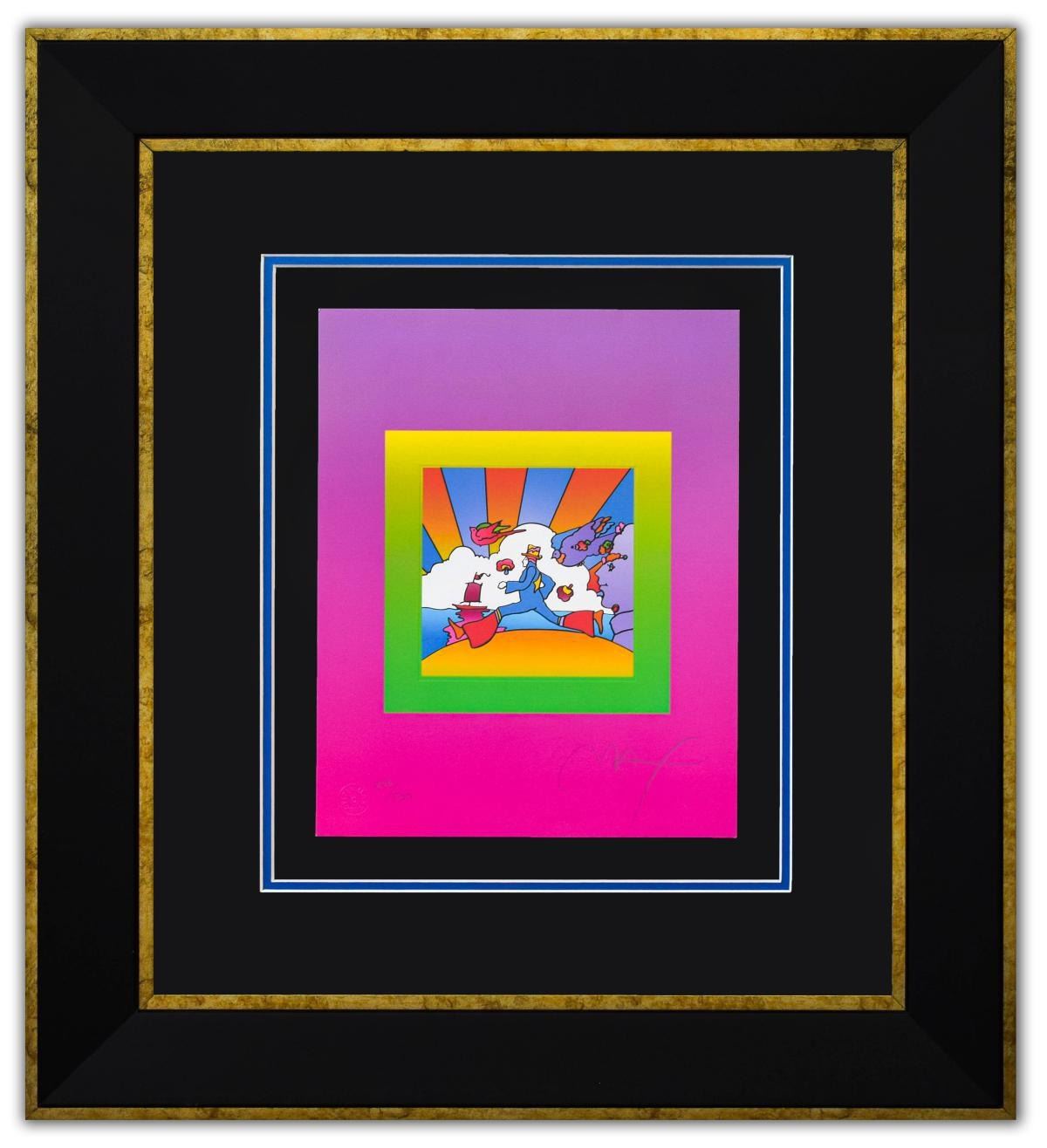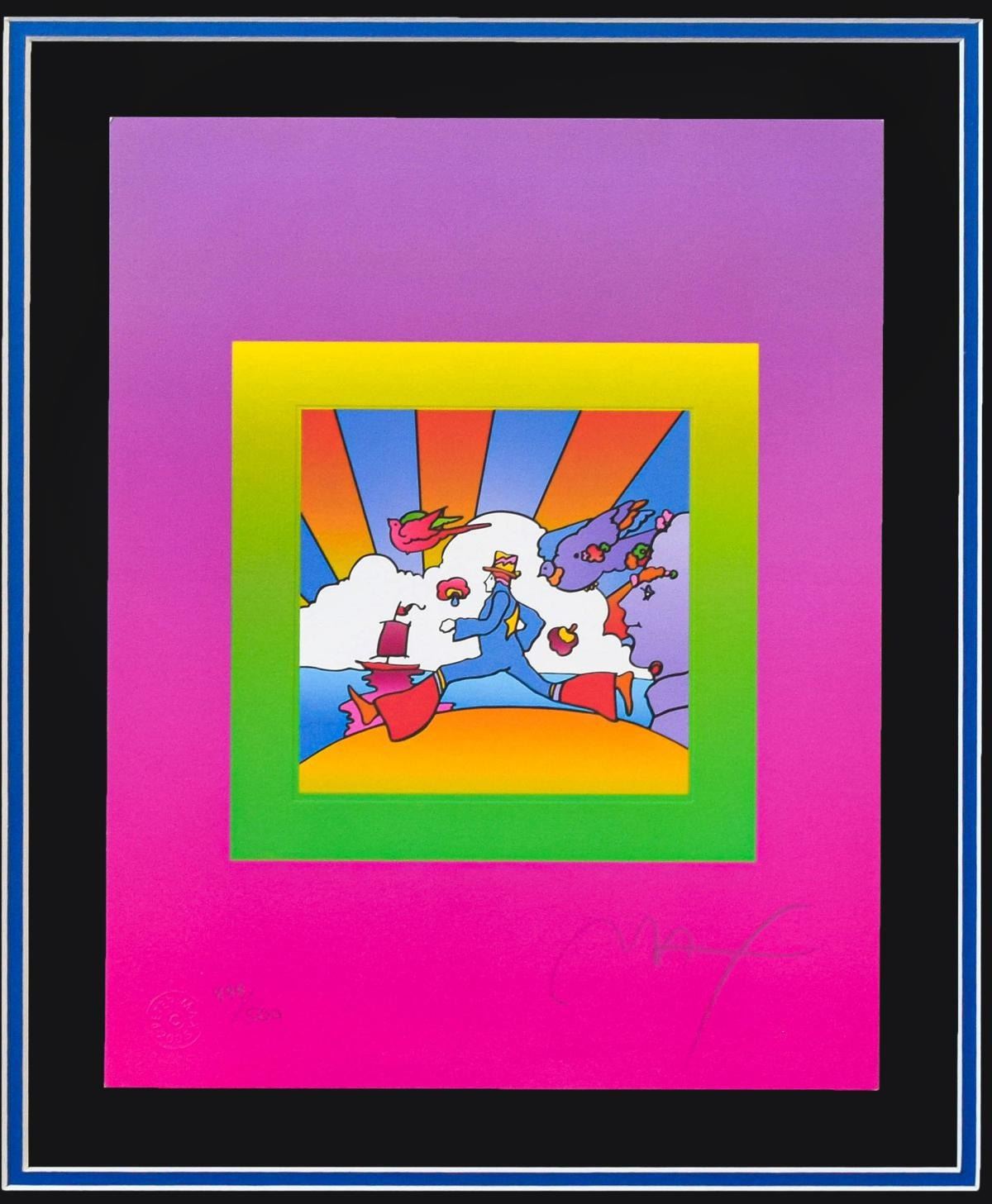Artist: Peter Max. Medium: Original Lithograph. Title: Cosmic Runner on Blends Ver. II. Size (Unframed): 12.5" x 10". Measures approx. (Framed): 26.5" x 23.5'. Certificate of Authenticity: From Peter Max Studio. Additional: Custom framed. Reference# 14673.