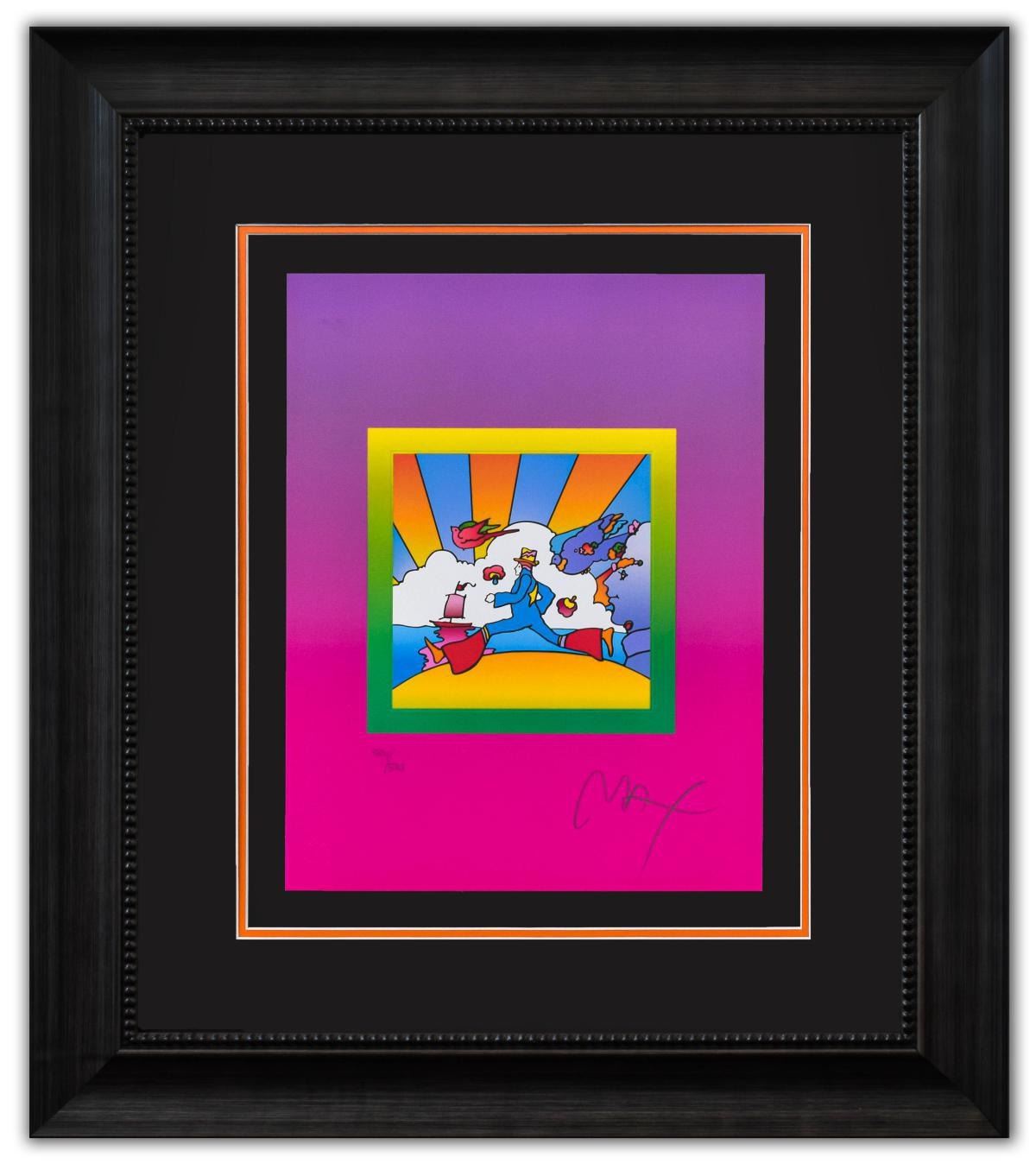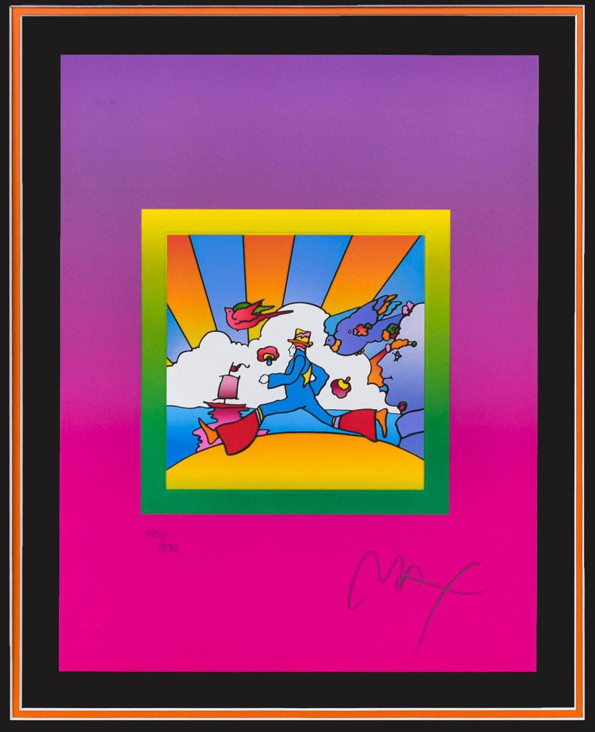 Artist: Peter Max. Medium: Original Lithograph. Title: Cosmic Runner on Blends Ver. II. Size (Unframed): 17" x 13". Measures approx. (Framed): 30" x 26.5". Certificate of Authenticity: From Peter Max Studio. Additional: Custom framed. Reference# 15037.