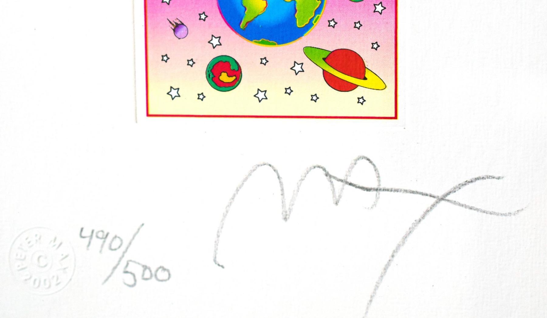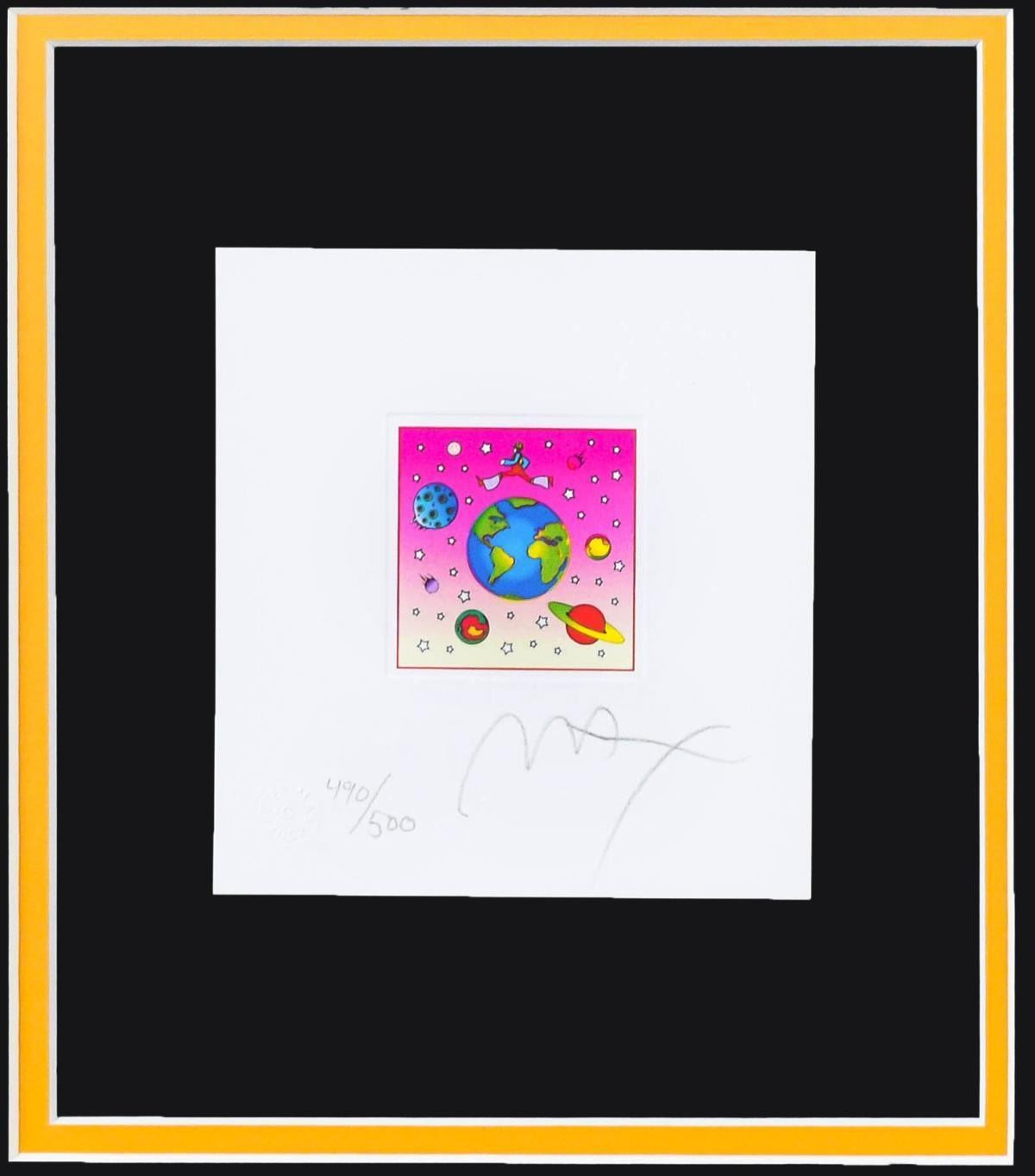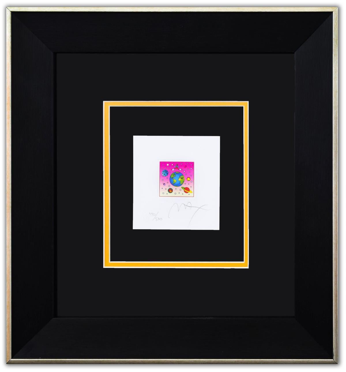 Artist: Peter Max. Medium: Original Lithograph. Title: Cosmic Runner with planets (Mini). Size (Unframed): 5" x 4.5". Size (Framed): 18" x 17". Certificate of Authenticity: From Peter Max Studio. Additional: Custom framed. Reference# 15910.