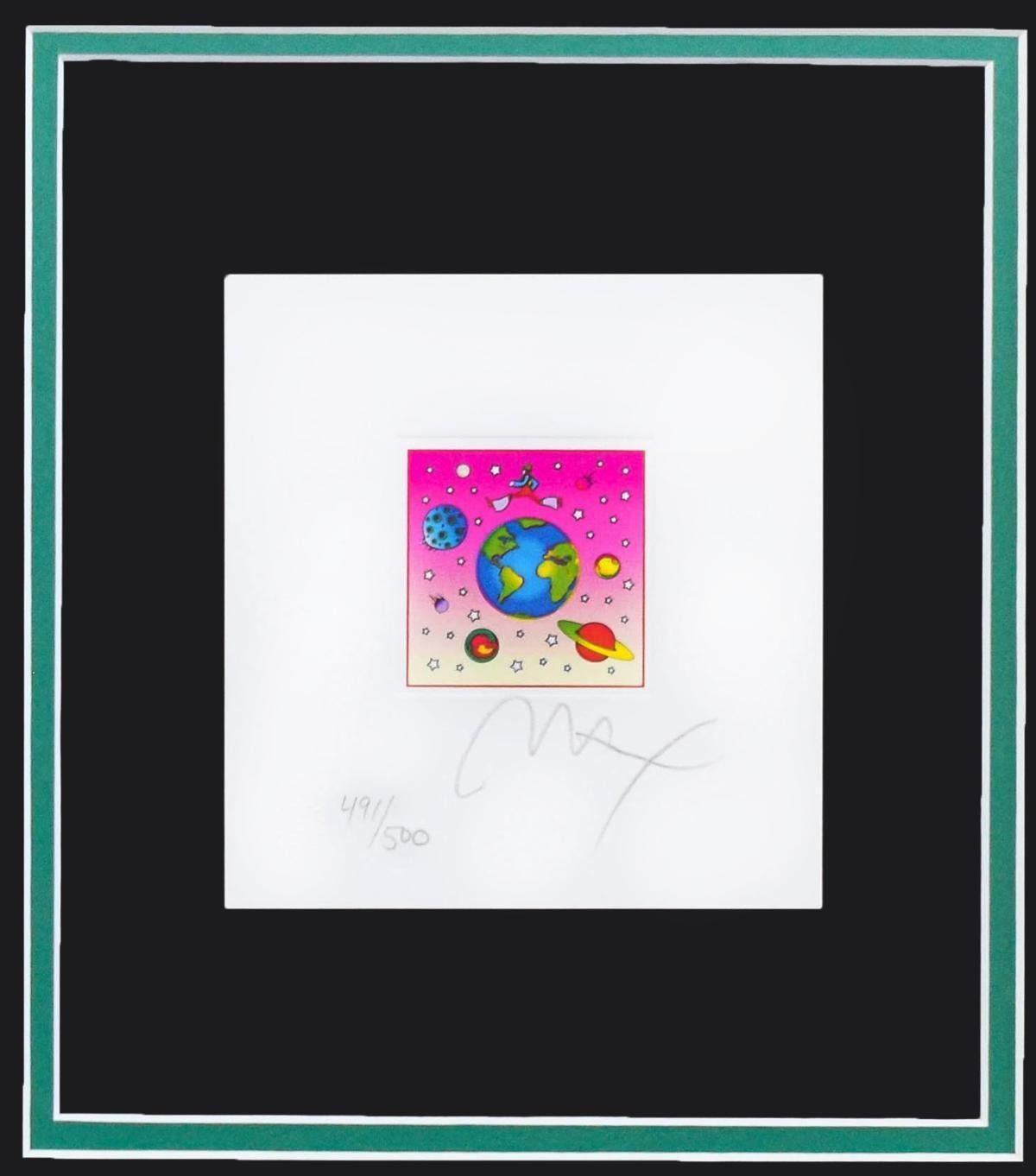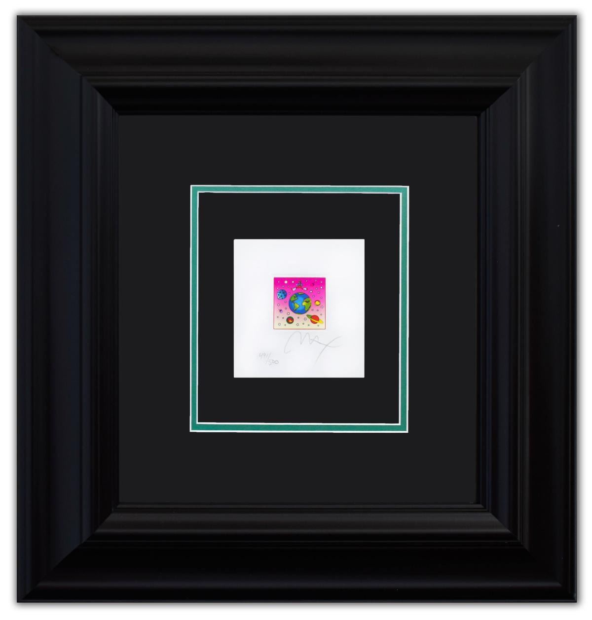 Artist: Peter Max. Medium: Original Lithograph. Title: Cosmic Runner with planets (Mini). Size (Unframed): 5" x 4.5". Size (Framed): 21" x 19". Certificate of Authenticity: From Peter Max Studio. Additional: Custom framed. Reference# 15580.