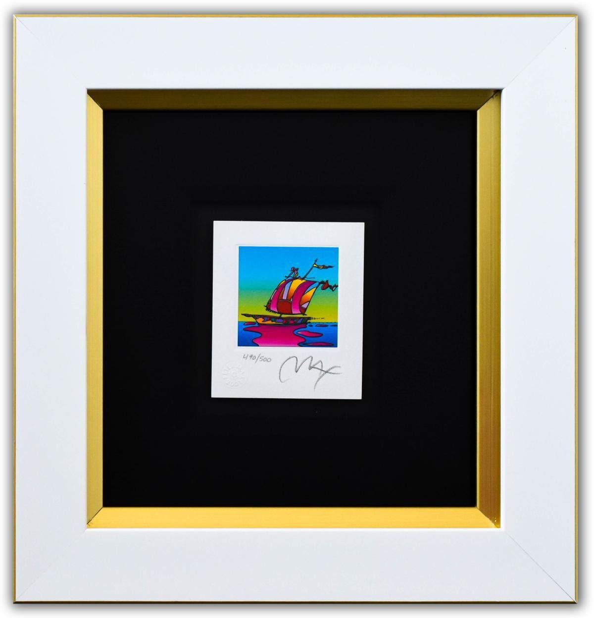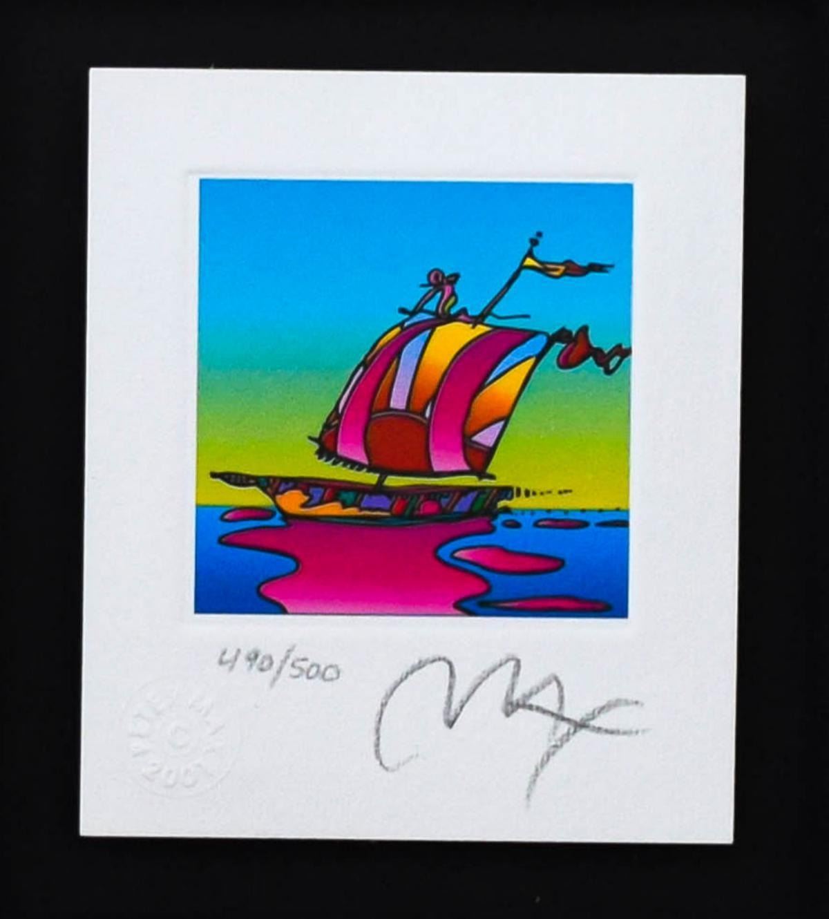 Artist: Peter Max. Medium: Original Lithograph. Title: Cosmic Sailboat (Mini). Size (Unframed): 3.5" x 3". Size (Framed): 12" x 11.5". Limited Edition: Numbered 490/500. Certificate of Authenticity: From Peter Max Studio. Additional: Custom framed. Reference# 13005.