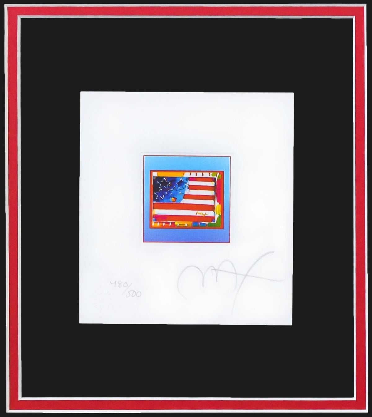 Artist: Peter Max. Medium: Original Lithograph. Title: Fiag with Heart on Blue. Size (Unframed): 5" x 4.5". Size (Framed): 19" x 18". Certificate of Authenticity: From Peter Max Studio. Additional: Custom framed. Reference# 15574.