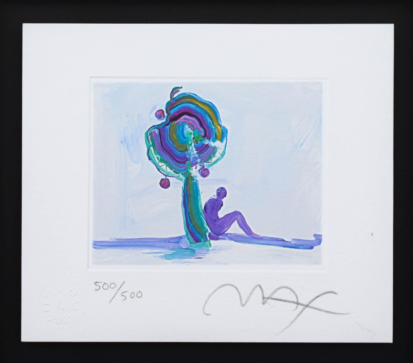 Artist: Peter Max. Medium: Original Lithograph. Title: Figure Under Tree (Mini). Size (Unframed): 5" x 6". Size (Framed): 13" x 13.5". Limited Edition: Numbered 500/500. Certificate of Authenticity: From Peter Max Studio. Additional: Custom framed. Reference# 13013.