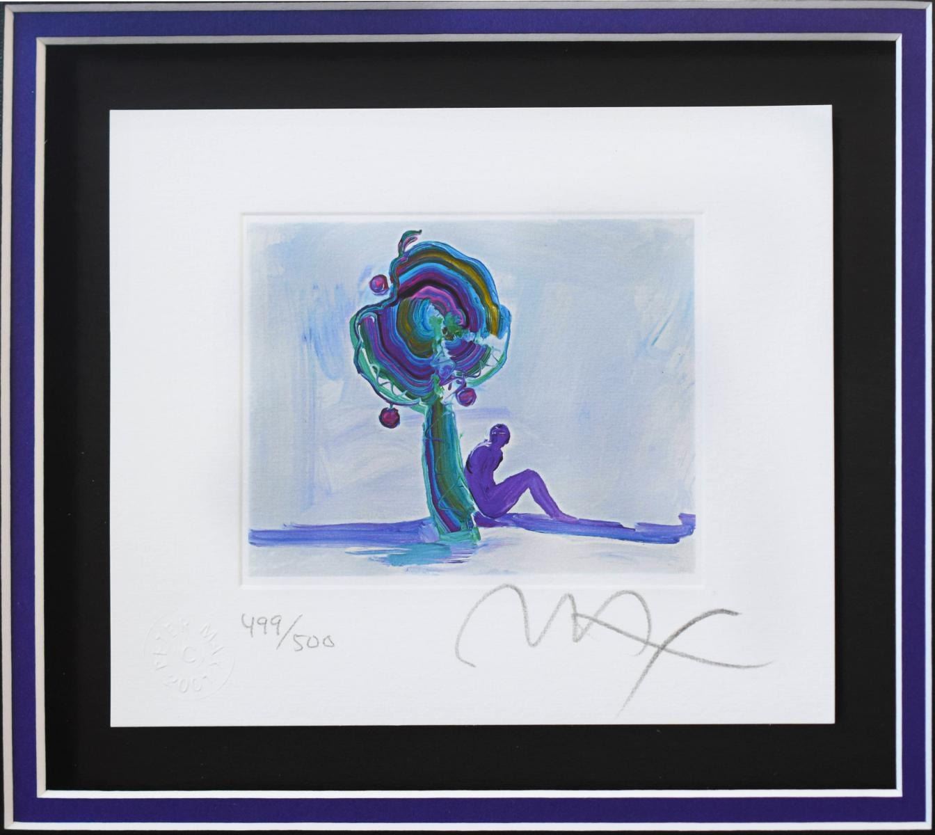 Artist: Peter Max. Medium: Original Lithograph. Title: Figure Under Tree (Mini). Size (Unframed): 5" x 6". Size (Framed): 17.5" x 18.5". Certificate of Authenticity: From Peter Max Studio. Additional: Custom framed. Reference# 14116.