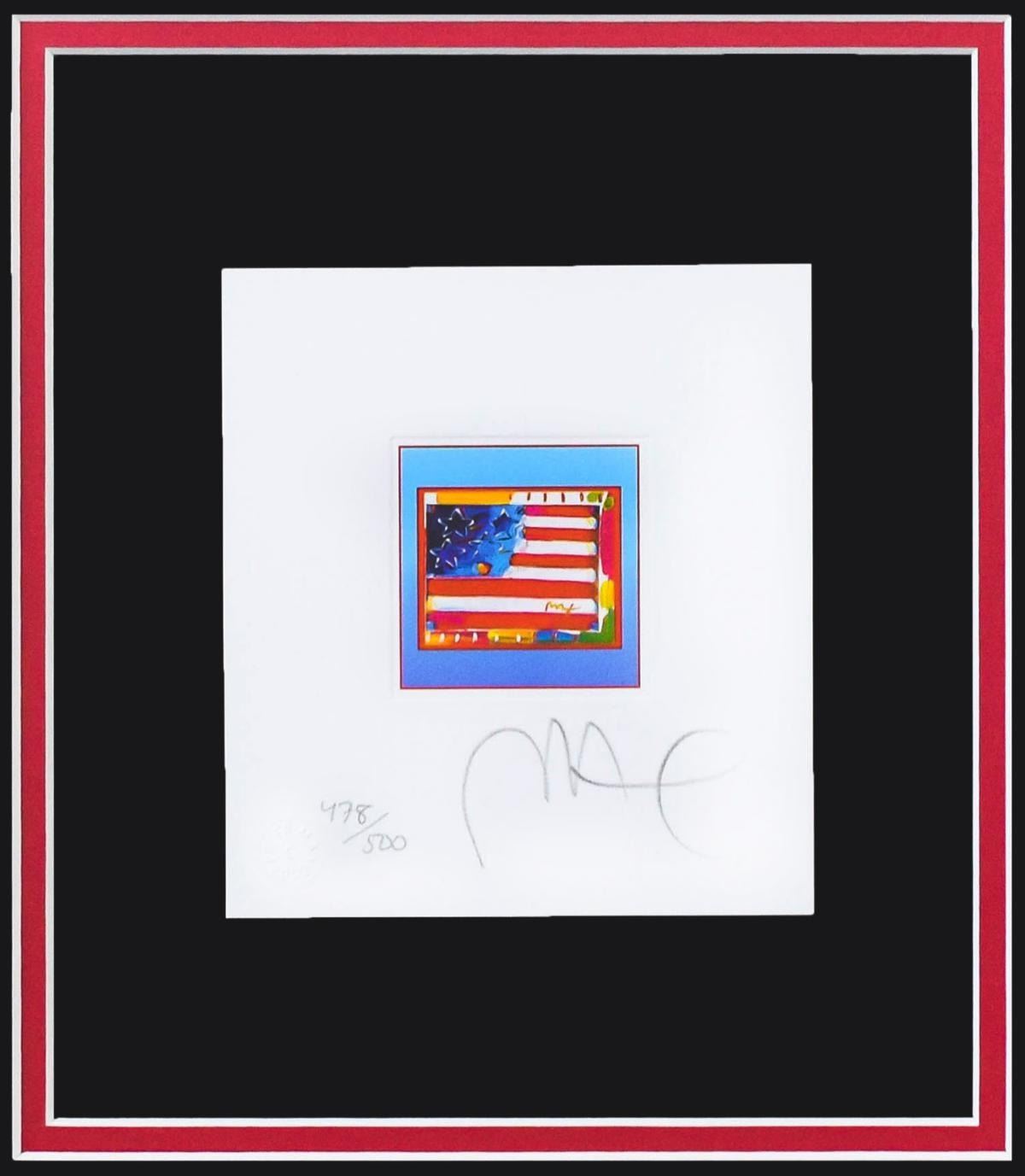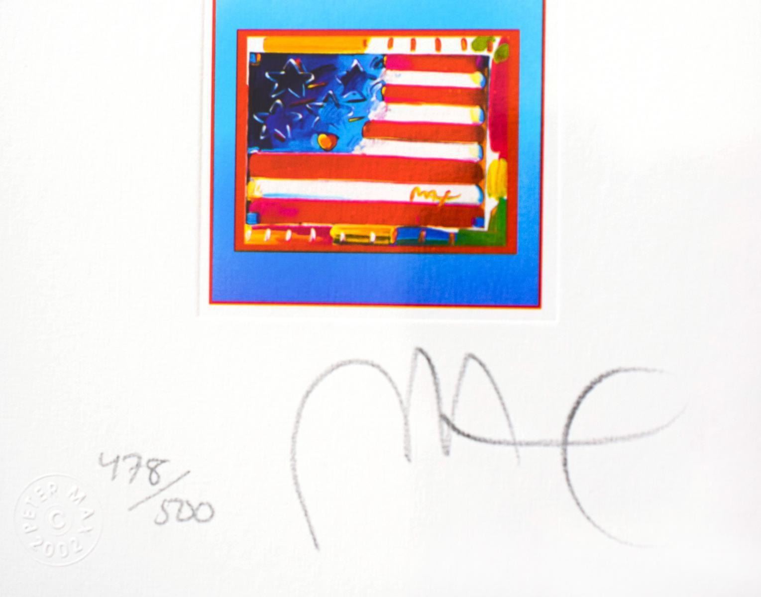 Artist: Peter Max. Medium: Original Lithograph. Title: Flag with Heart on Blue. Size (Unframed): 5" x 4.5". Size (Framed): 17" x 16". Certificate of Authenticity: From Peter Max Studio. Additional: Custom framed. Reference# 15905.