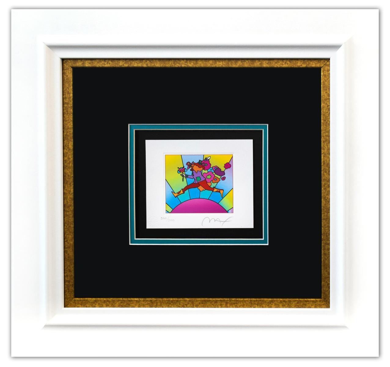 Artist: Peter Max. Medium: Original Lithograph. Title: Flower Jumper Over Sunrise Ver. I (mini). Size (Unframed): 4.5" x 5.5". Size (Framed): 17.5" x 18.5". Certificate of Authenticity: From Peter Max Studio. Additional: Custom framed. Reference# 14120.