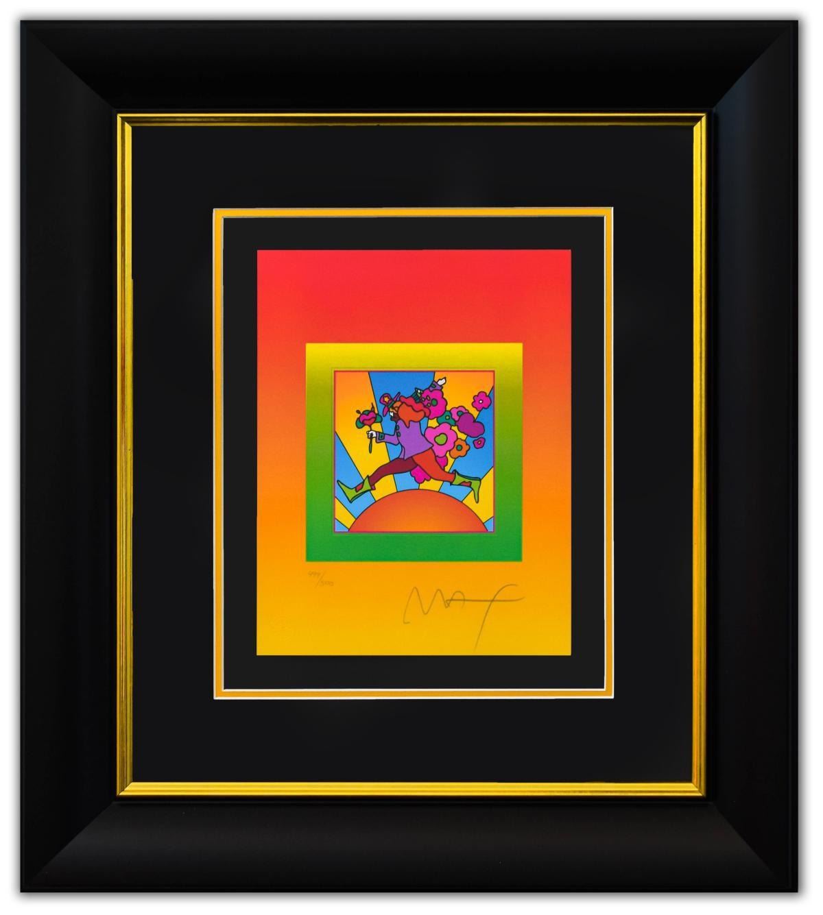 Artist: Peter Max. Medium: Original Lithograph. Title: Flower Jumper over Sunrise on Blends. Size (Unframed): 12.5" x 10". Size (Framed): 27" x 24". Certificate of Authenticity: From Peter Max Studio. Additional: Custom framed. Reference# 14672.