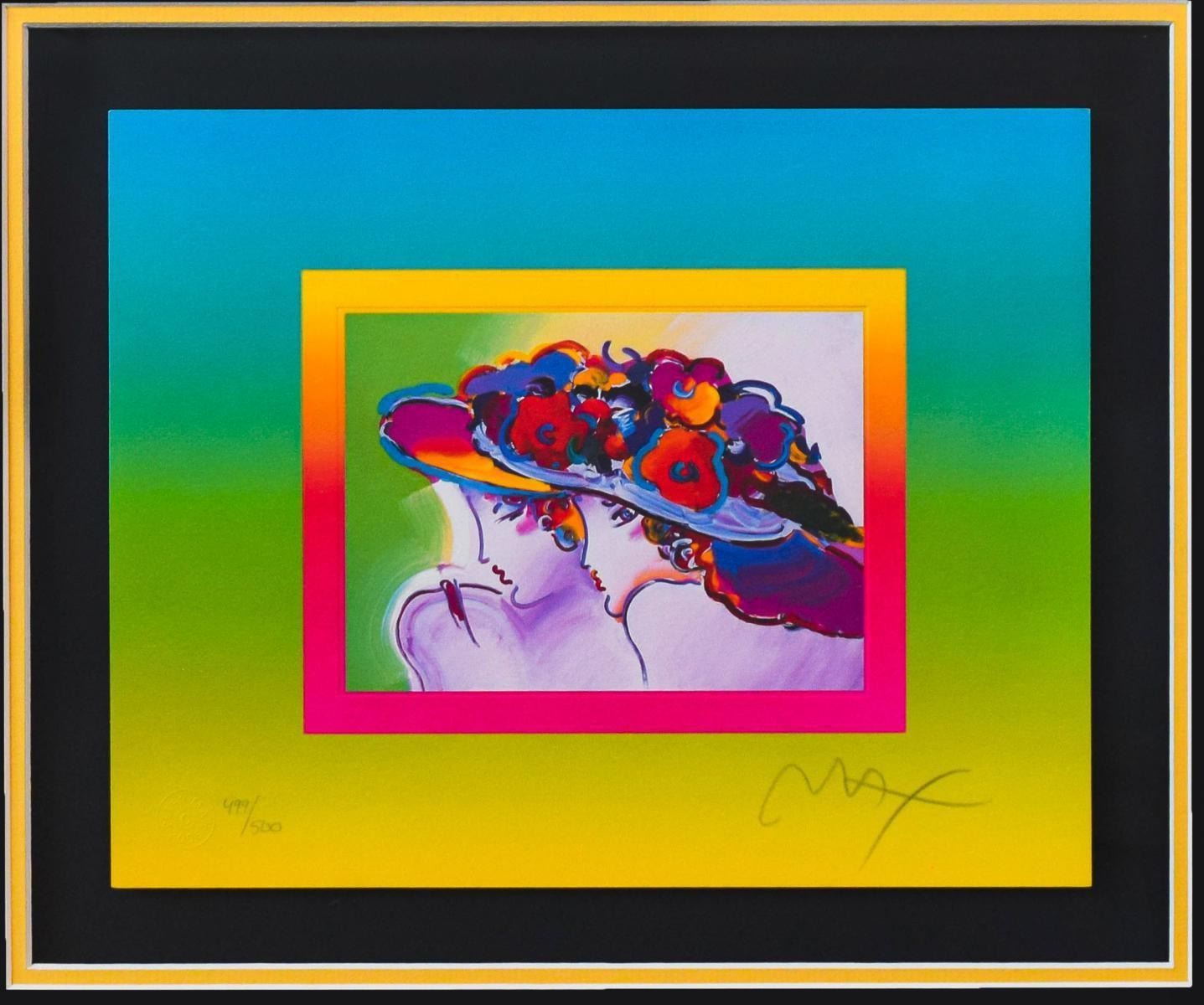 Artist: Peter Max. Medium: Original Lithograph. Title: Friends on Blends. Size (Unframed): 10" x 12.5". Size (Framed): 24" x 27". Certificate of Authenticity: From Peter Max Studio. Additional: Custom framed. Reference# 14627.