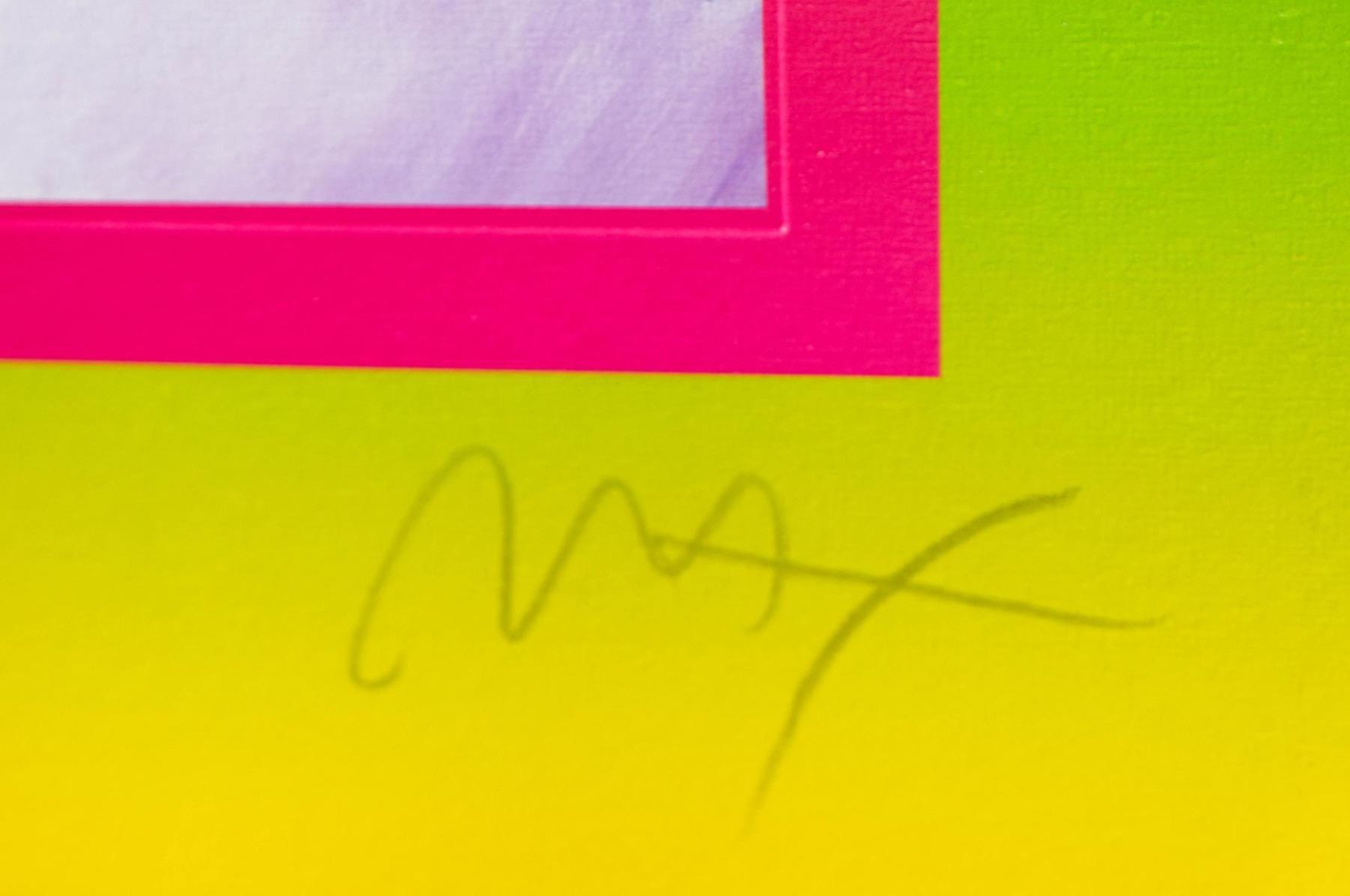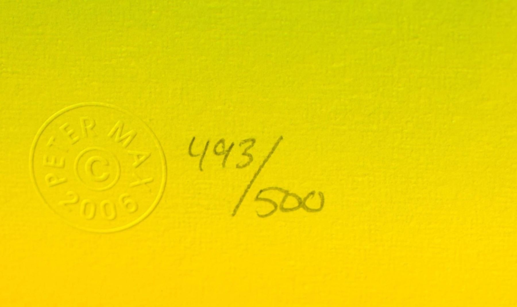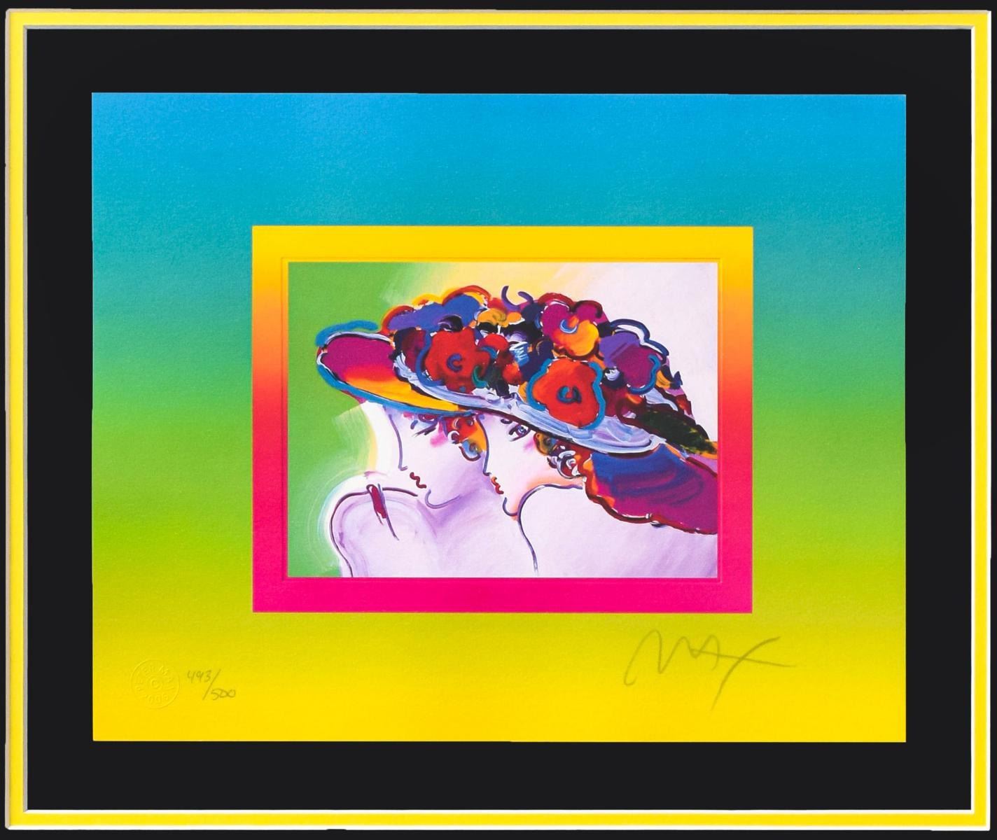 Artist: Peter Max. Medium: Original Lithograph. Title: Friends on Blends. Size (Unframed): 10" x 12.5". Measures approx. (Framed): 22.5" x 25". Certificate of Authenticity: From Peter Max Studio. Additional: Custom framed. Reference# 15885.