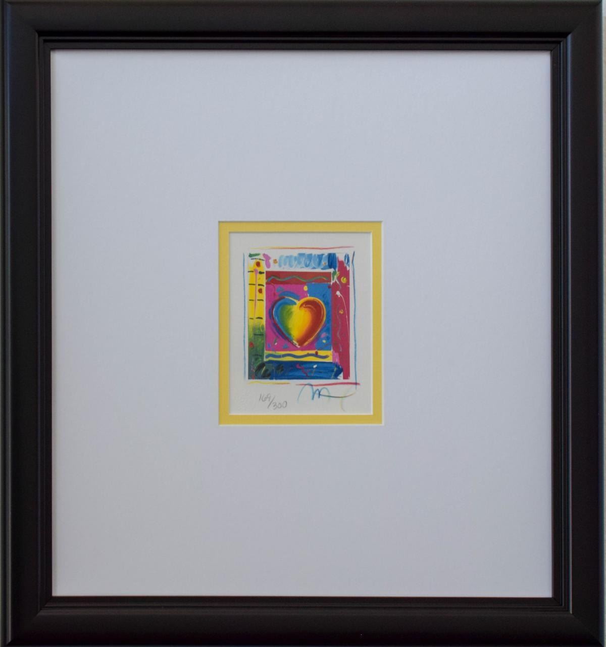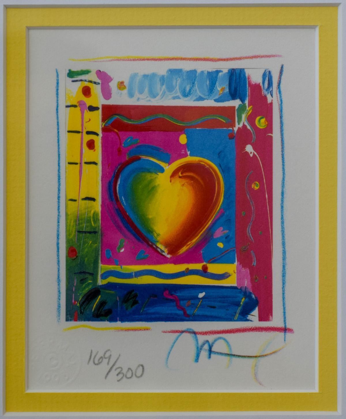 Artist: Peter Max. Medium: Original Lithograph. Title: Heart Series III. Size (Unframed): 6" x 5". Size (Framed): 17" x 16". Limited Edition: Numbered 169/300. Certificate of Authenticity: From Max Studios. Additional: Custom framed. Reference# 11068.