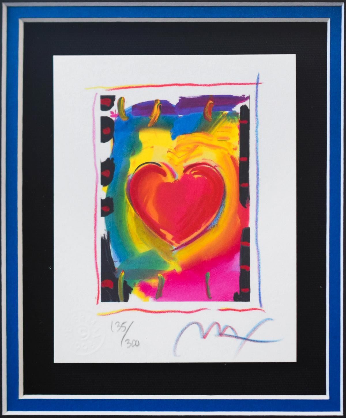 Artist: Peter Max. Medium: Original Lithograph. Title: Heart Series I. Size (Unframed): 5" x 4". Size (Framed): 19.5" x 18.5". Certificate of Authenticity: From Peter Max Studio. Additional: Custom framed. Reference# 14103.