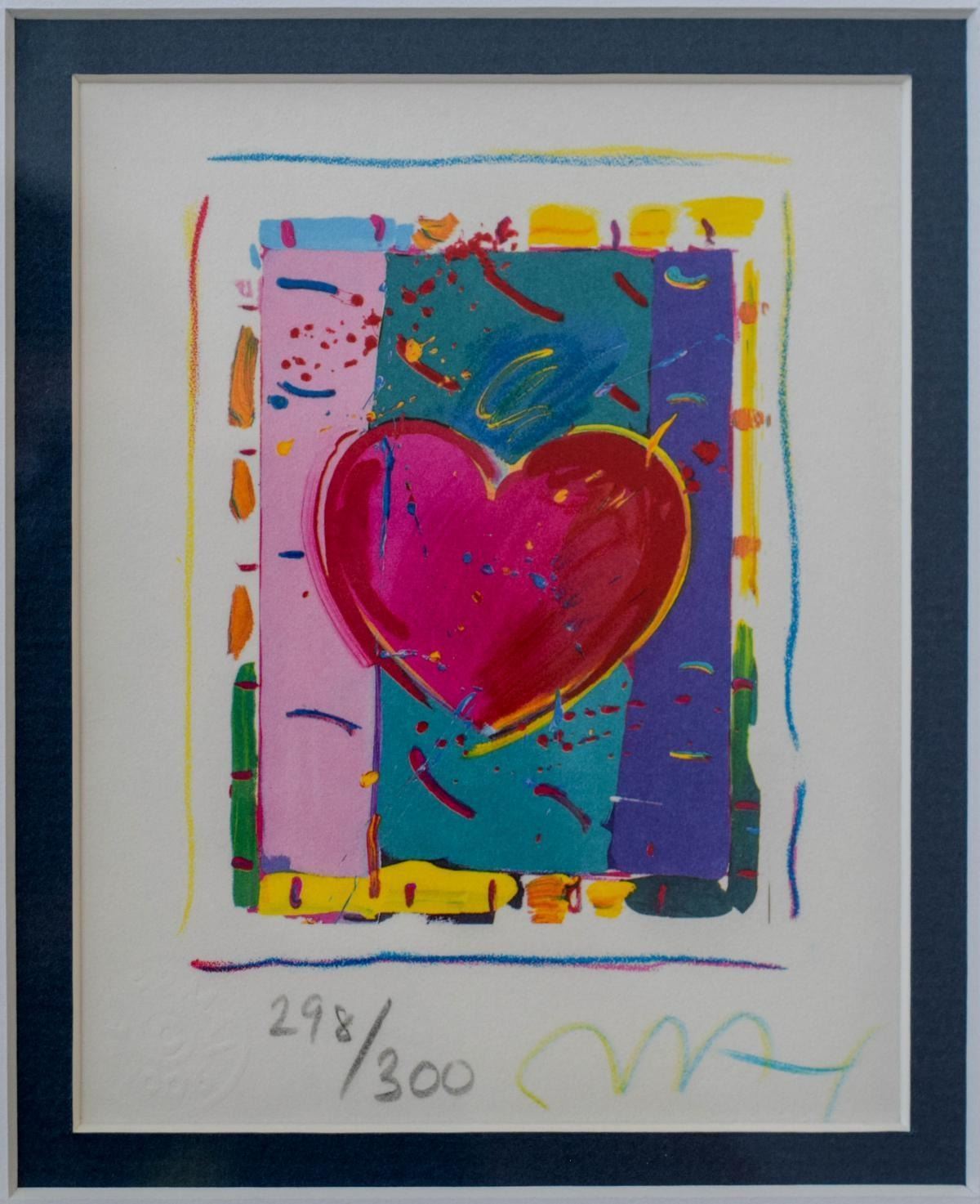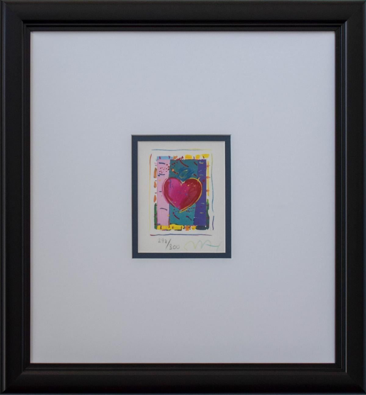 Artist: Peter Max. Medium: Original Lithograph. Title: Heart Series VI. Size (Unframed): 4" x 3". Size (Framed): 17" x 16". Certificate of Authenticity: Is included. Additional: Custom framed. Reference# 11066.
