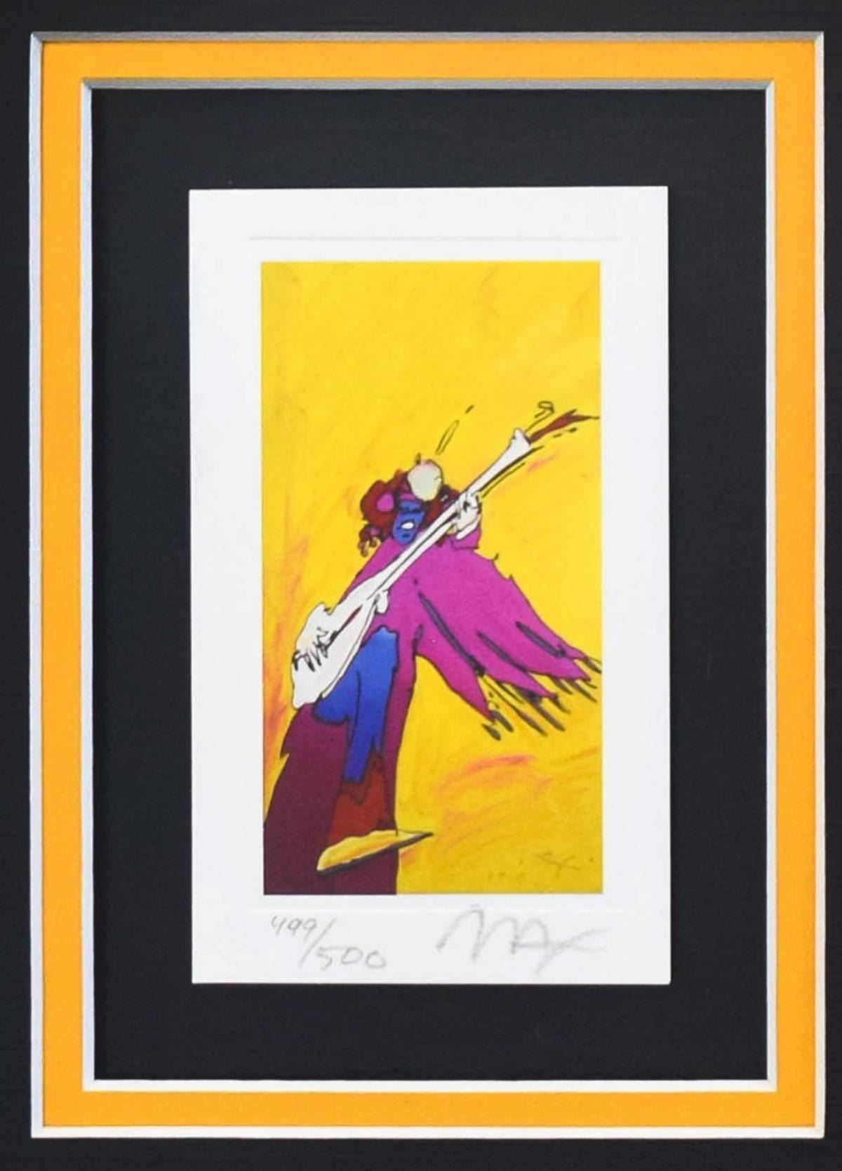Artist: Peter Max. Medium: Original Lithograph. Title: Hendrix II (Mini). Size (Unframed): 3" x 2.5". Size (Framed): 18" x 16". Certificate of Authenticity: From Peter Max Studio. Additional: Custom framed. Reference# 14099.