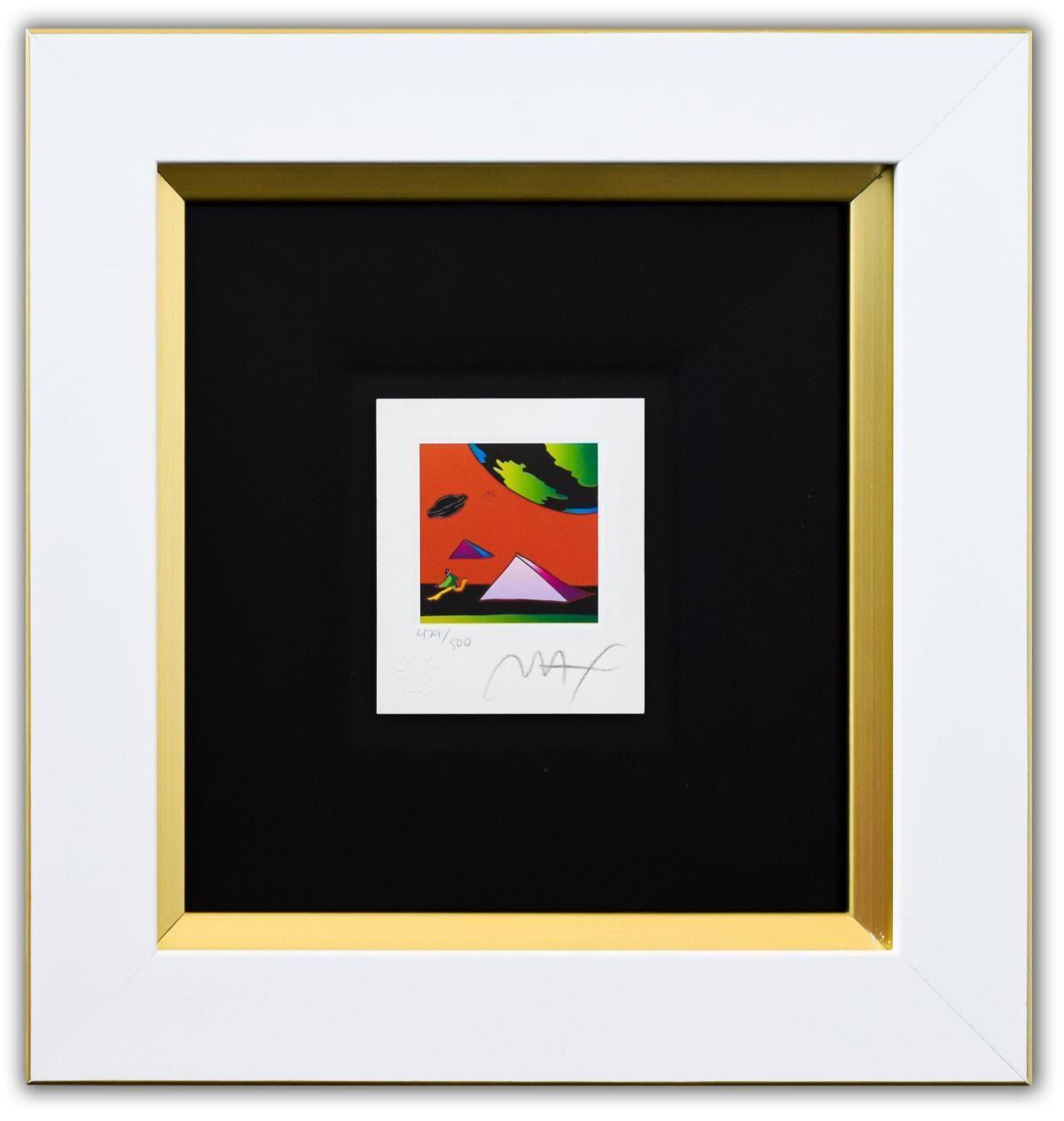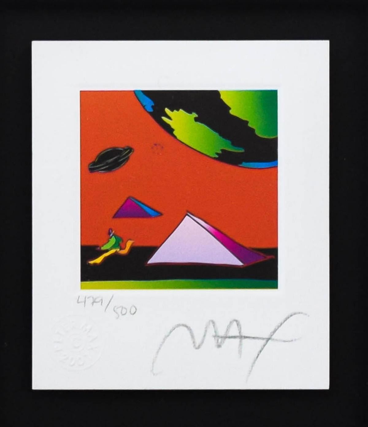 Artist: Peter Max. Medium: Original Lithograph. Title: Jumper with Two Pyramids (Mini). Size (Unframed): 3.5" x 3". Size (Framed): 12" x 11.5". Limited Edition: Numbered 479/500. Certificate of Authenticity: From Peter Max Studio. Additional: Custom framed. Reference# 13006.