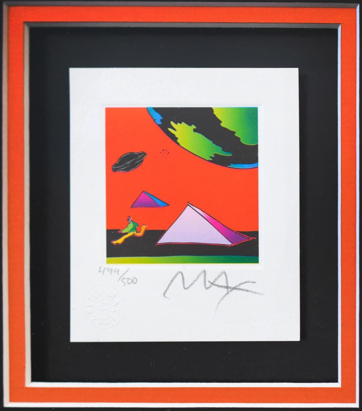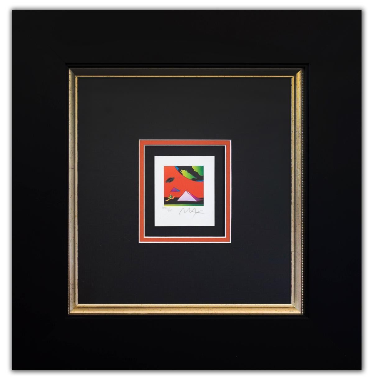 Artist: Peter Max. Medium: Original Lithograph. Title: Jumper with Two Pyramids (Mini). Size (Unframed): 3.5" x 3". Size (Framed): 18" x 17.5". Certificate of Authenticity: From Peter Max Studio. Additional: Custom framed. Reference# 14100.
