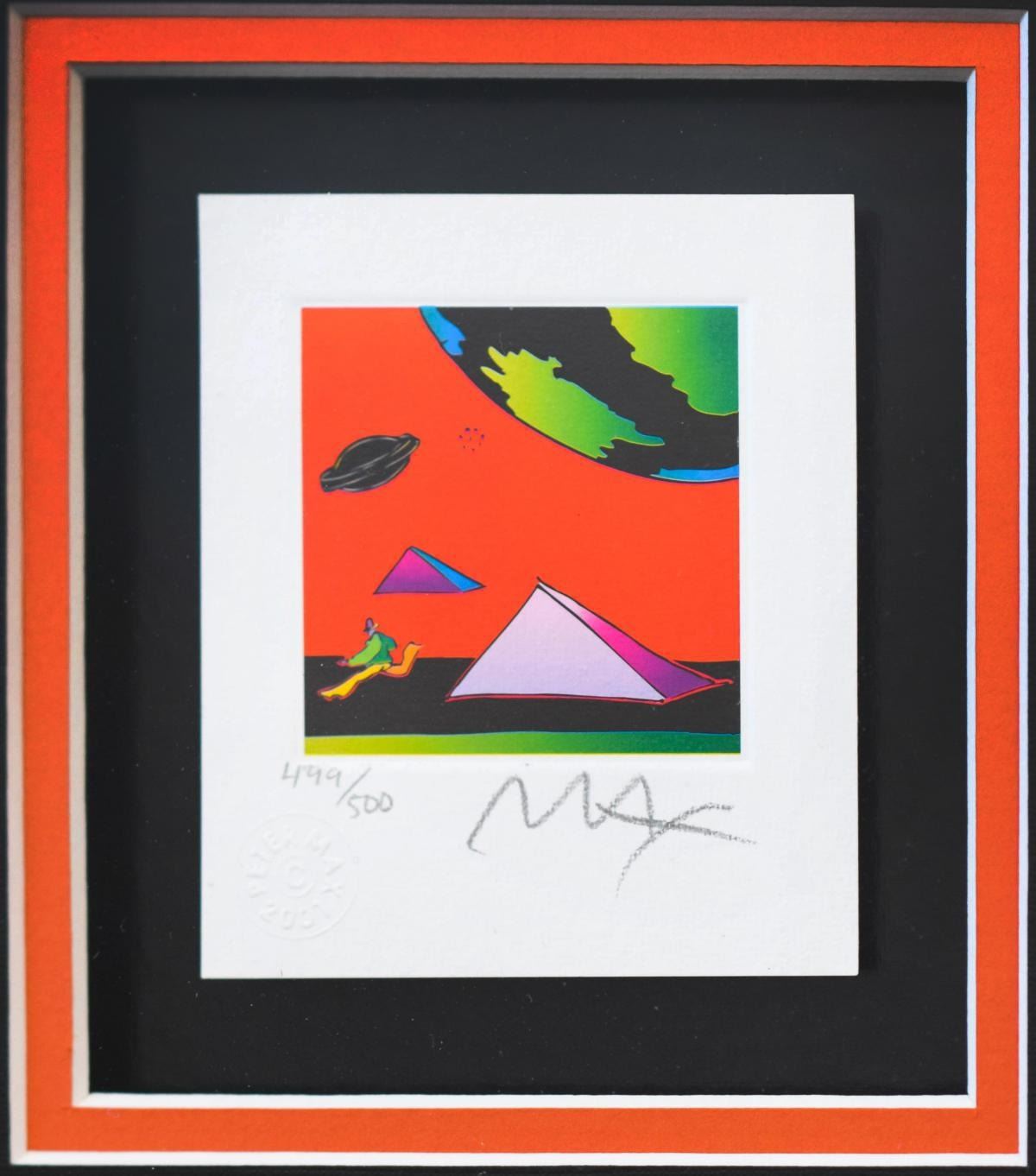 Artist: Peter Max. Medium: Original Lithograph. Title: Jumper with Two Pyramids (Mini). Size (Unframed): 3.5" x 3". Measures approx. (Framed): 18" x 17.5". Certificate of Authenticity: From Peter Max Studio. Additional: Custom framed. Reference# 14100.