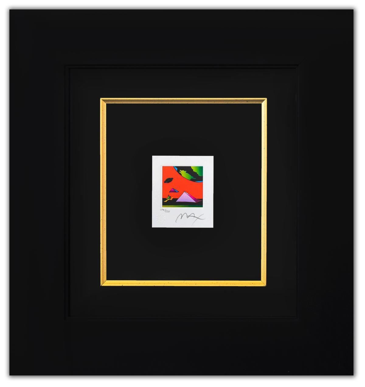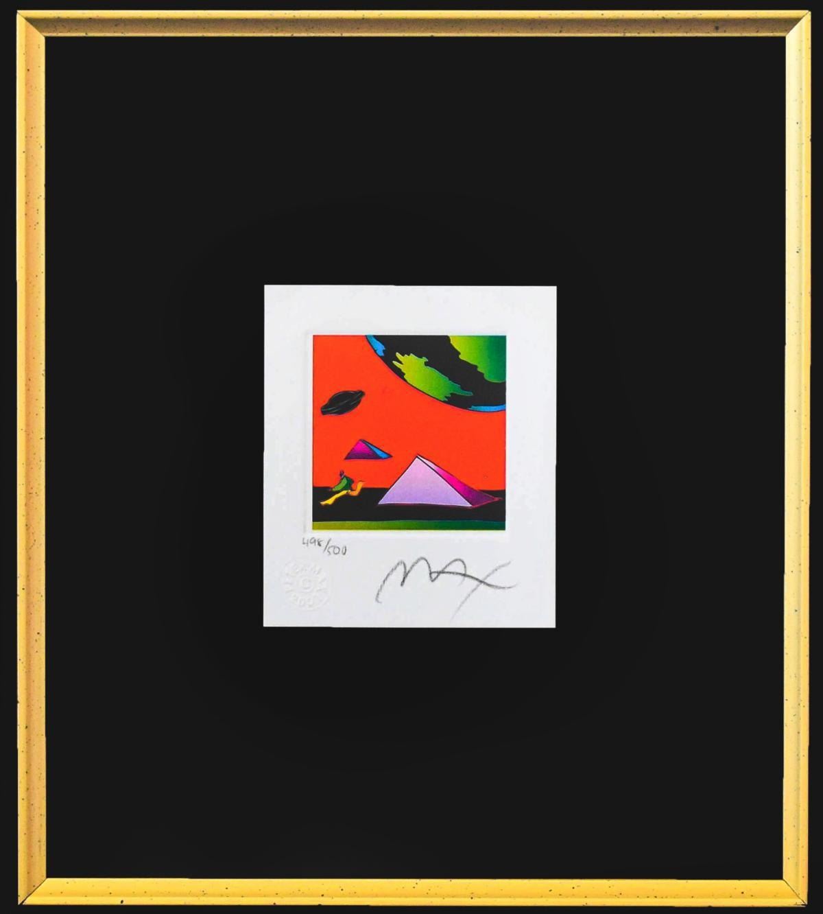 Artist: Peter Max. Medium: Original Lithograph. Title: Jumper with Two Pyramids (Mini). Size (Unframed): 3.5" x 3". Measures approx. (Framed): 18" x 17". Certificate of Authenticity: From Peter Max Studio. Additional: Custom framed. Reference# 14717.