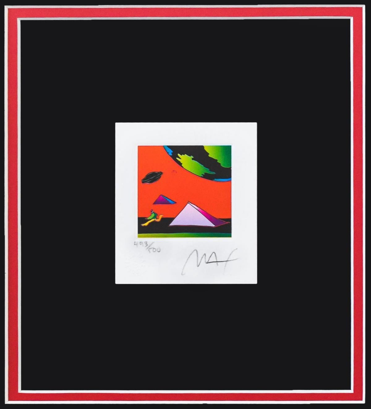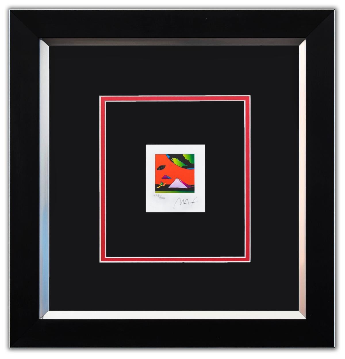 Artist: Peter Max. Medium: Original Lithograph. Title: Jumper with Two Pyramids (Mini). Size (Unframed): 3.5" x 3". Measures approx. (Framed): 17" x 16". Certificate of Authenticity: From Peter Max Studio. Additional: Custom framed. Reference# 15035.