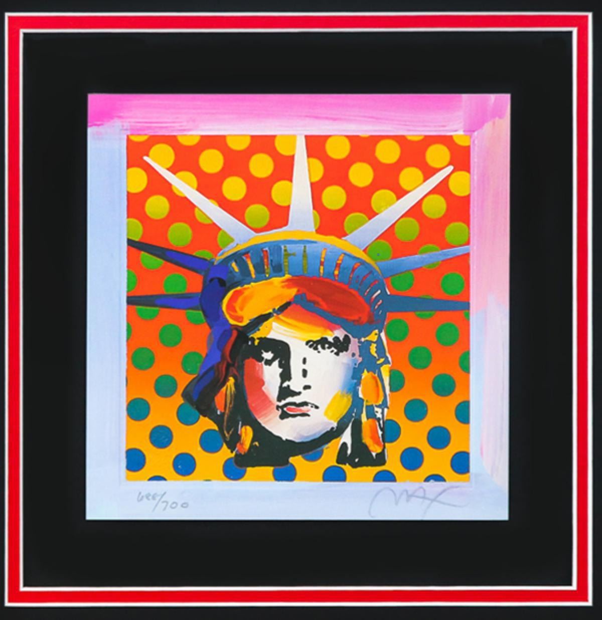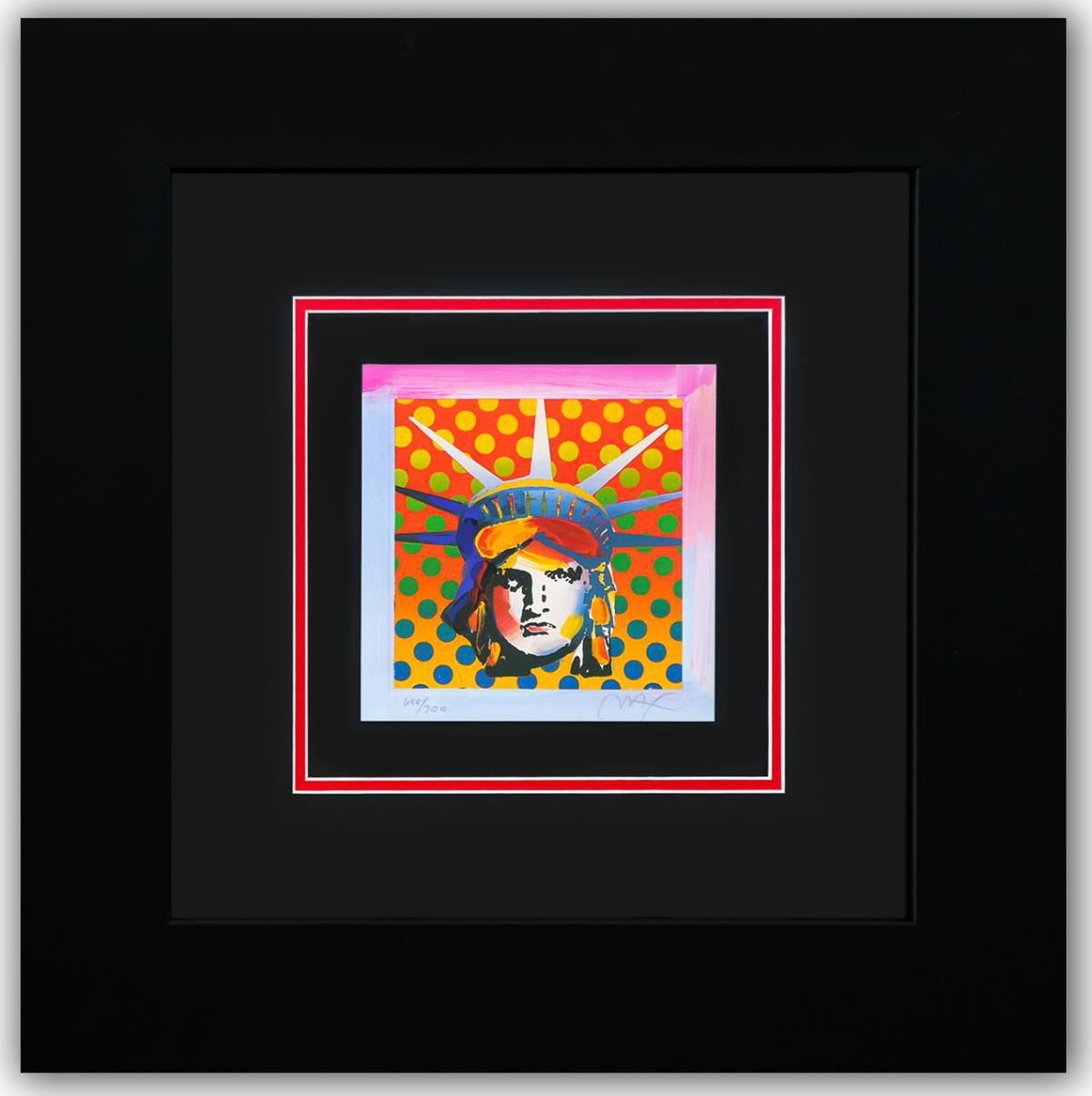 Artist: Peter Max. Medium: Original Lithograph. Title: LIBERTY HEAD (Mini). Size (Unframed): 7" x 7". Measures approx. (Framed): 20" x 20". Certificate of Authenticity: From Peter Max Studio. Additional: Custom framed. Reference# 17845.