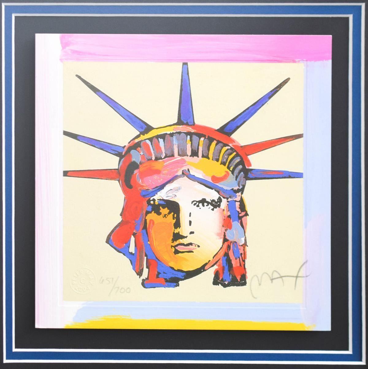 Artist: Peter Max. Medium: Original Lithograph. Title: Liberty Head X (Mini). Size (Unframed): 7" x 7". Limited Edition: Numbered 657/700. Certificate of Authenticity: From Peter Max Studio. Additional: Custom framed. Reference# 11759.
