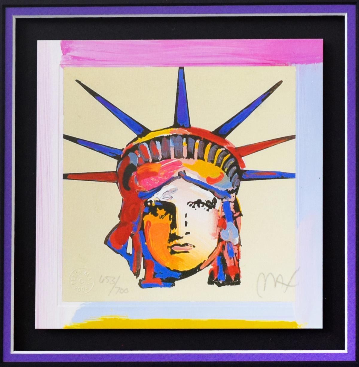 Artist: Peter Max. Medium: Original Lithograph. Title: Liberty Head X (Mini). Size (Unframed): 7" x 7". Size (Framed): 16" x 16". Limited Edition: Numbered /700. Certificate of Authenticity: From Peter Max Studio. Additional: Custom framed. Reference# 12857.