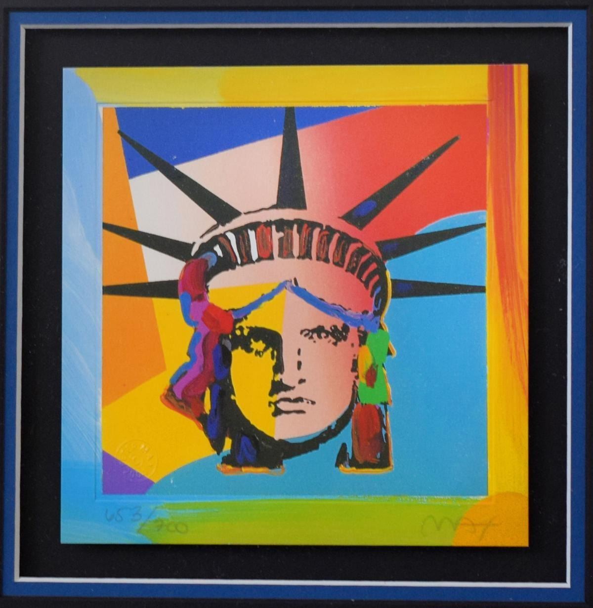 Artist: Peter Max. Medium: Original Lithograph. Title: Liberty Head XV (Mini). Size (Unframed): 7" x 7". Size (Framed): 16" x 16". Limited Edition: Numbered /700. Certificate of Authenticity: From Peter Max Studio. Additional: Custom framed. Reference# 12856.