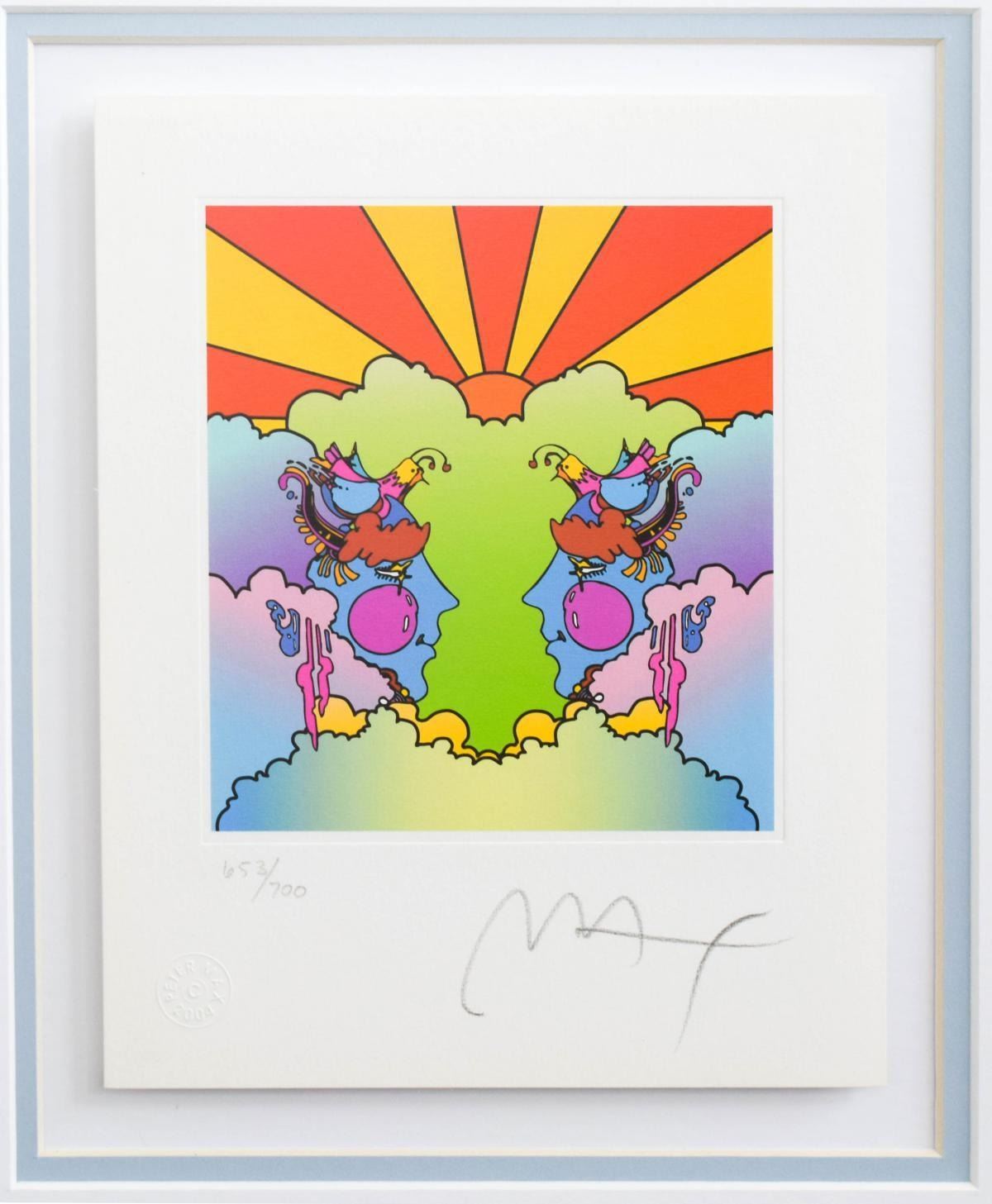 Artist: Peter Max. Medium: Original Lithograph. Title: Profile And Sunrise (Mini). Size (Unframed): 8" x 6.5". Size (Framed): 17.5" x 16". Limited Edition: Numbered 653/700. Certificate of Authenticity: From Peter Max Studio. Additional: Custom framed. Reference# 11762.