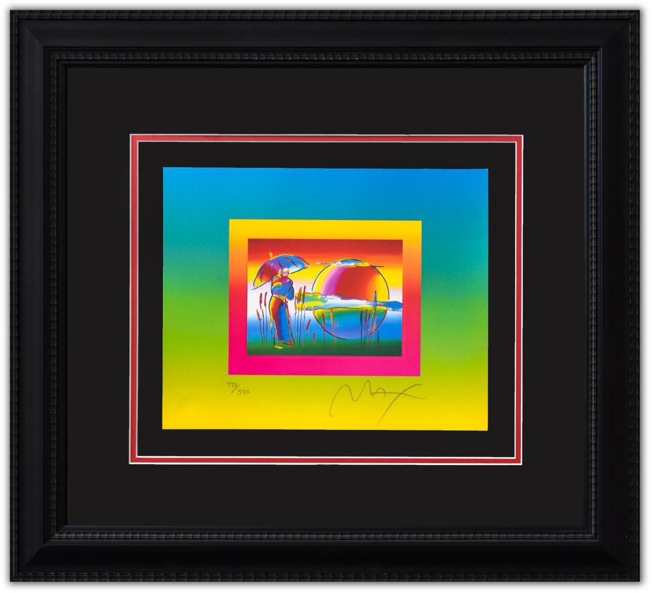 Artist: Peter Max. Medium: Original Lithograph. Title: RAINBOW UNBRELLA MAN ON BLENDS. Size (Unframed): 10" x 12.5". Size (Framed): 21" x 24". Certificate of Authenticity: From Peter Max Studio. Additional: Custom framed. Reference# 15894.
