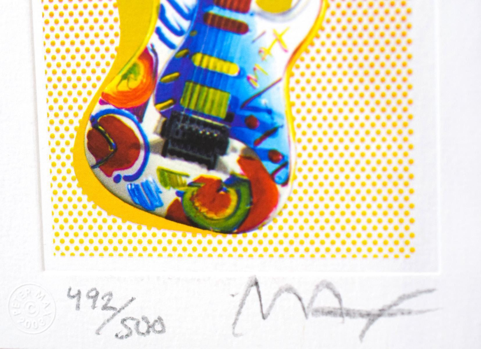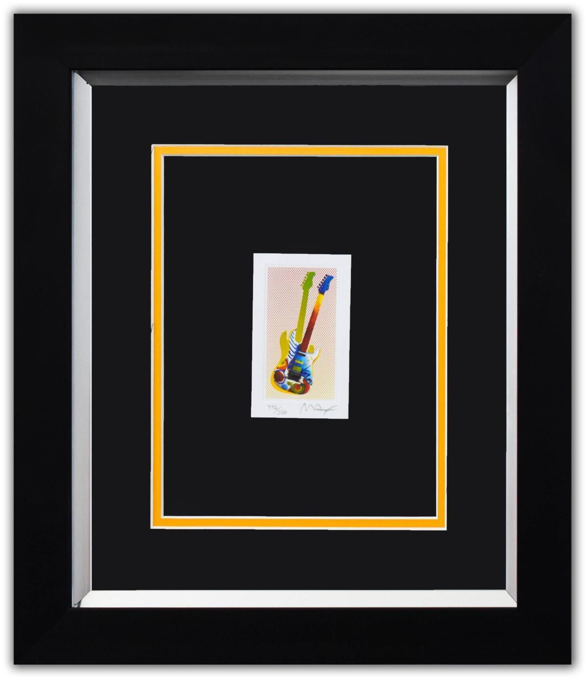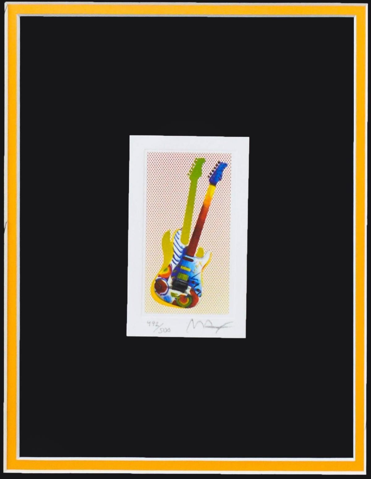 Artist: Peter Max. Medium: Original Lithograph. Title: ROCK N ROLL GUITAR I. Size (Unframed): 4" x 2.5". Size (Framed): 16" x 14". Certificate of Authenticity: From Peter Max Studio. Additional: Custom framed. Reference# 15912.