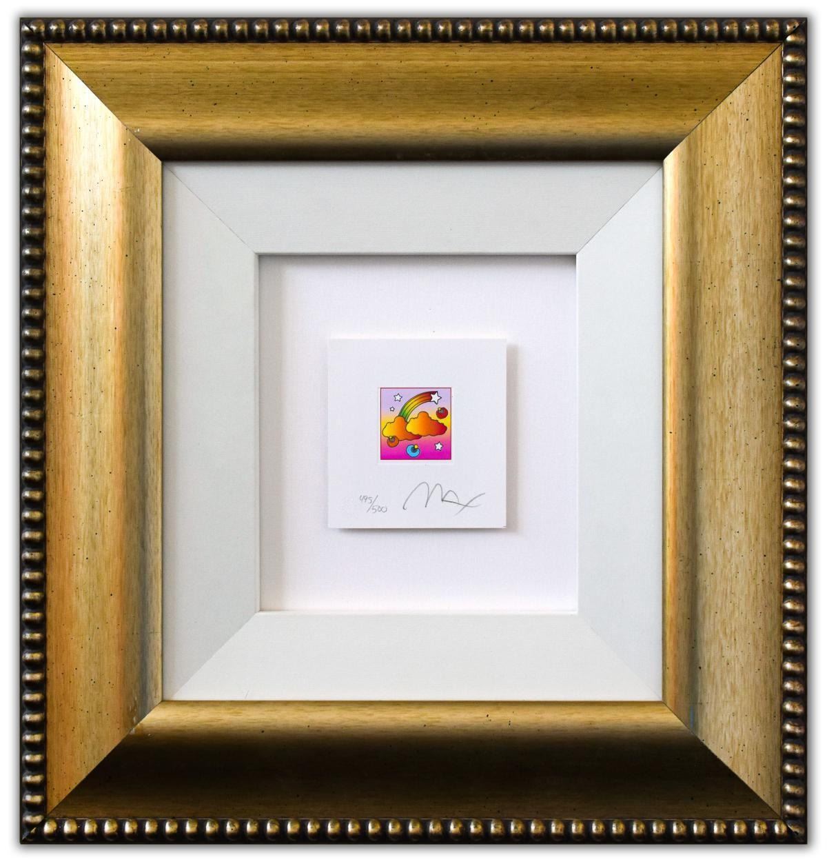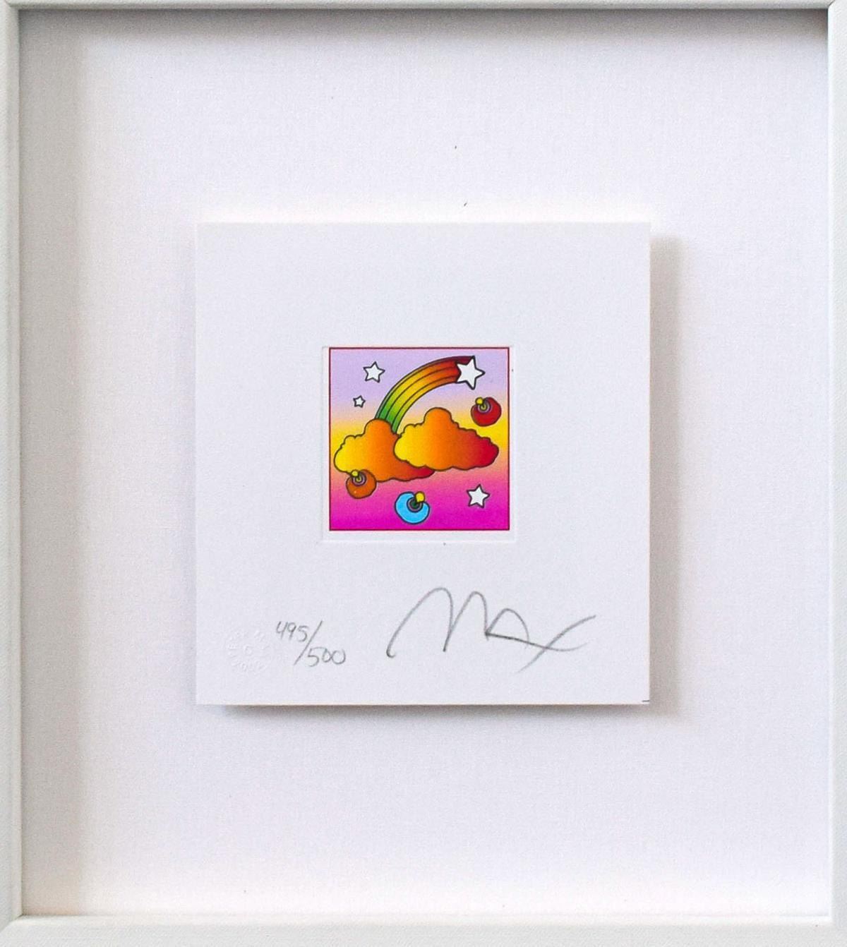 Artist: Peter Max. Medium: Original Lithograph. Title: Rainbow with Clouds (Mini). Size (Unframed): 5" x 4.5". Size (Framed): 21" x 20". Certificate of Authenticity: From Peter Max Studio. Additional: Custom framed. Reference# 15015.