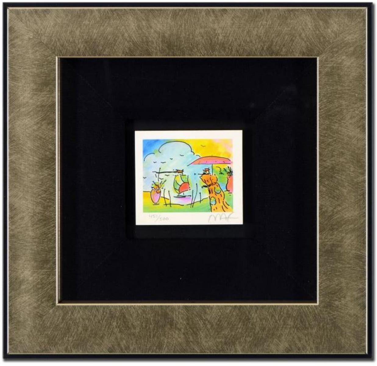 Artist: Peter Max. Medium: Original Lithograph. Title: Sage Sailboat & Vase (Series II Ver. I). Size (Unframed): 3" x 3.5". Size (Framed): 10" x 10.5". Limited Edition: Numbered 451/500. Certificate of Authenticity: From Peter Max Studio. Additional: Custom framed. Reference# 12331.