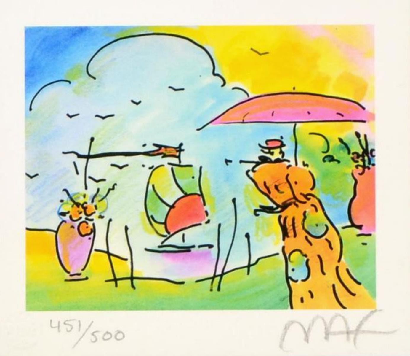 Artist: Peter Max. Medium: Original Lithograph. Title: Sage Sailboat & Vase (Series II Ver. I). Size (Unframed): 3" x 3.5". Size (Framed): 10" x 10.5". Limited Edition: Numbered 451/500. Certificate of Authenticity: From Peter Max Studio. Additional: Custom framed. Reference# 12331.